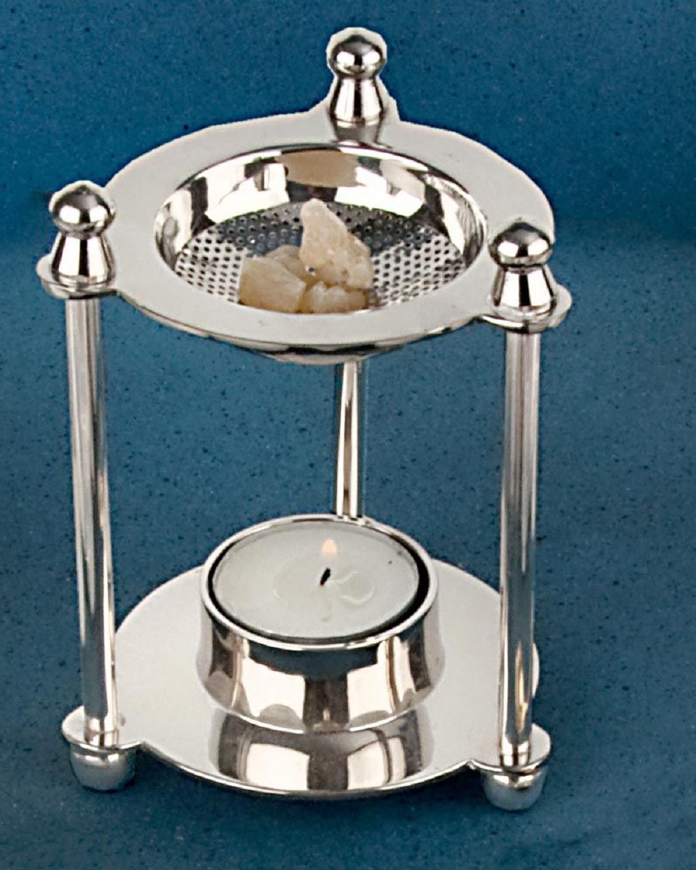 Tischräuchergefäß vernickelt, mit Teelicht und Siebeinsatz, Messing poliert, 9 cm Ø, 12 cm hoch.