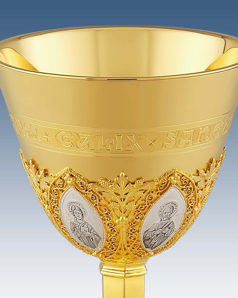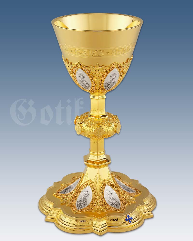 Kelch gotisch 22 cm hoch, vergoldet. Die Silbercuppa 925 Sterling Silber hat 11 cm Ø. Der reich verzierte Handarbeitskelch ist mit gravierten, versilberten Medaillons der 12 Aposteln gearbeitet.