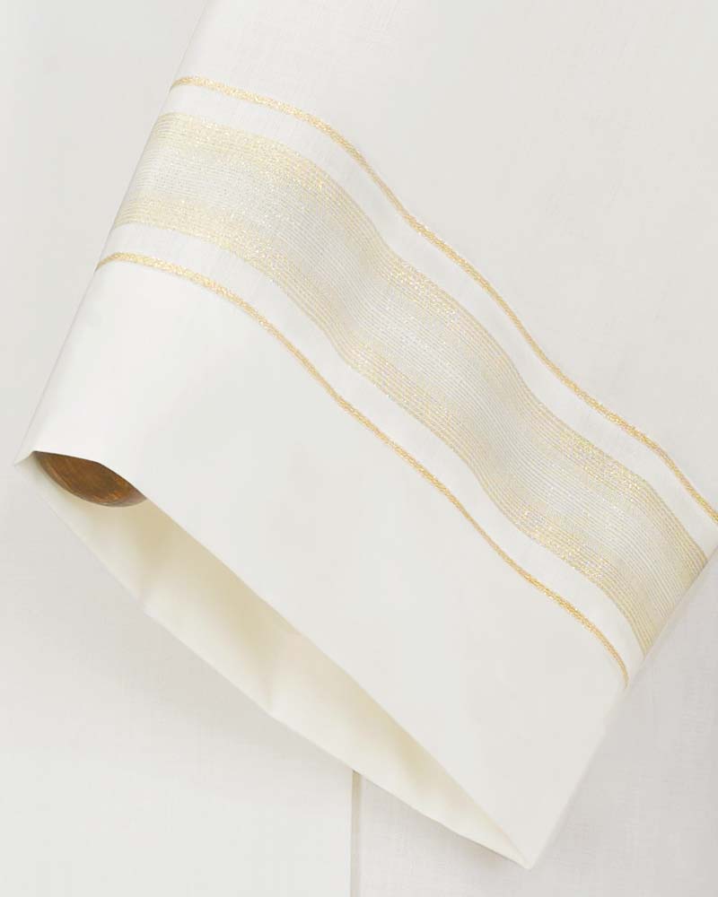 Priesteralben aus knitterarmem und pflegeleichten Paramentenstoff in 55% Polyester, 45% Wolle, waschbar bei 30 Grad. Mit feinen Webbordüren an den Ärmelabschlüssen und am Albensaum, seitlichem Tascheneingriff, vorne und hinten in Falten gelegt.