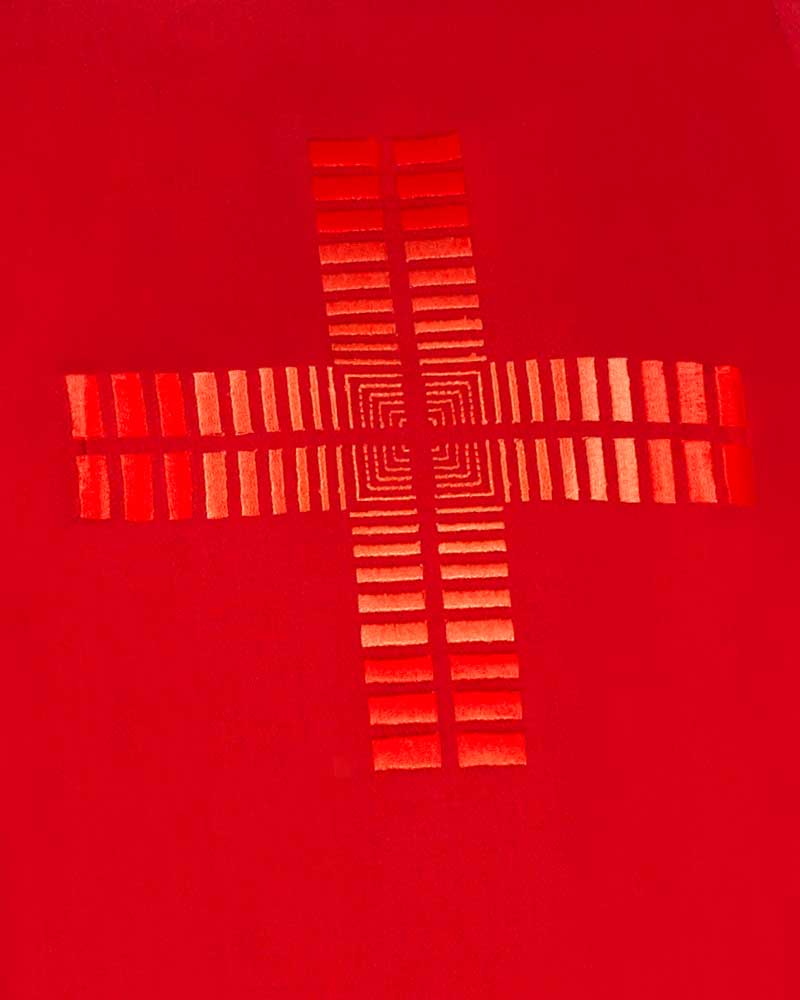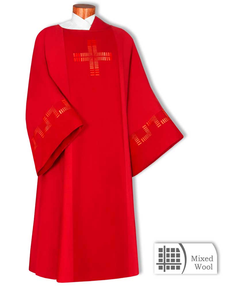 Dalmatik in schlichter Ausführung, mit gesticktem Kreuzsymbol und Ornamentik als Armabschluss. Der leichte Paramentenstoff aus 65% Wolle und 35% Polyester ist knitterarm und strapazierfähig. Konfektion mit weiten Ärmeln, 125 cm lang, seitlich geschlitzt, gefüttert mit Seidenponge, mit schmaler Diakonstola im Faconschnitt.
