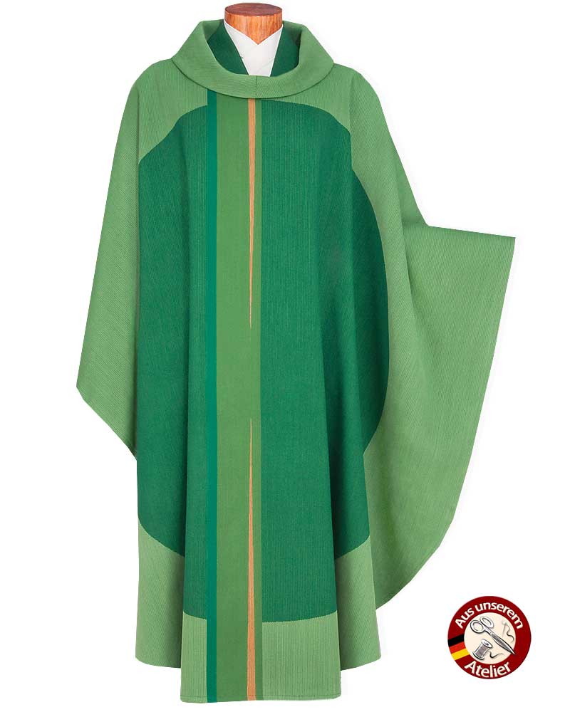 Messgewandgrün, mit eindrucksvollem Lichtstreifendesign aus hochwertigem Jacquardgewebe, Konfektion mit umgelegtem Rundkragen und Innenstola, 138 cm lang. Der strapazierfähige und knitterarme Paramentenstoff aus 70% Wolle und 30% Polyester, ist mit Seidenponge abgefüttert.
