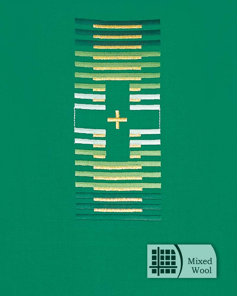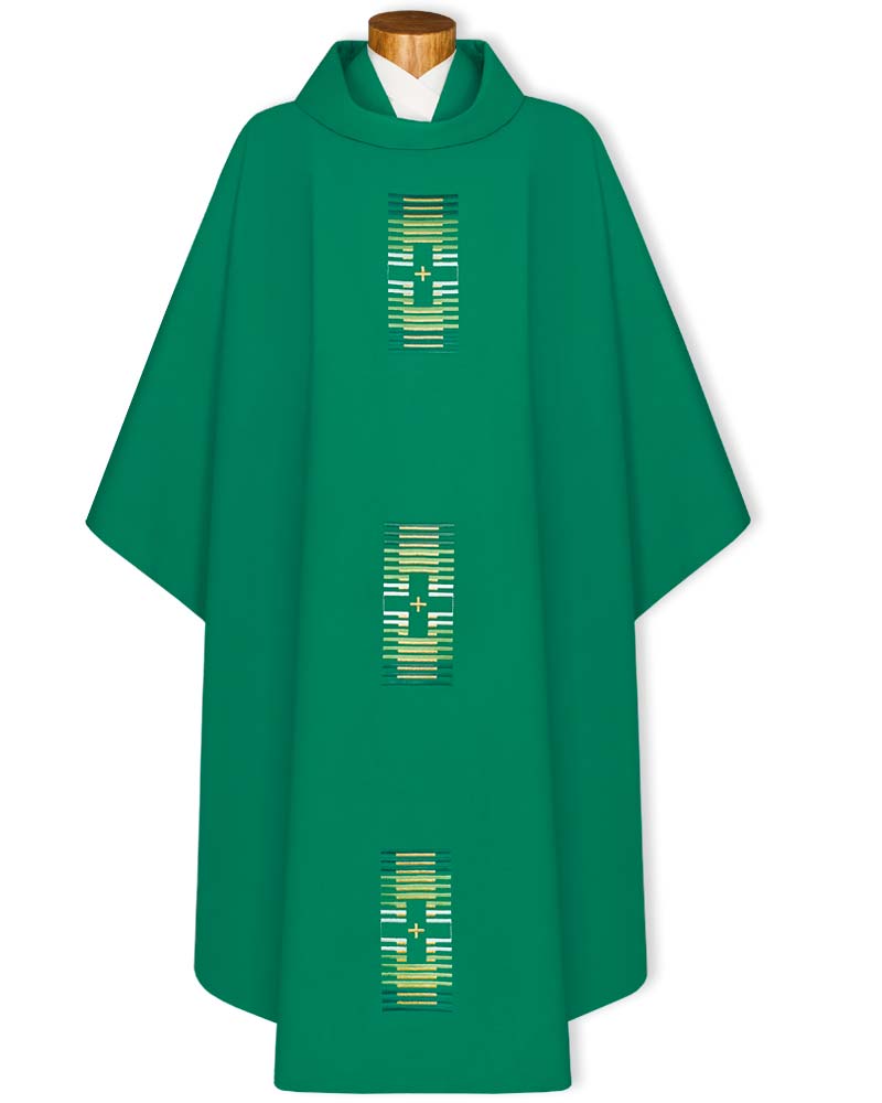 Kasel grün, in schlichter Ausführung aus leichtem Paramentenstoff, 55 % Polyester und 45 % Wolle, knitterarm, strapazierfähig und waschbar bei 30 Grad. Die Kaselvorder- und Rückseite sind mit je drei Kreuzornamenten bestickt. Konfektion mit umgelegtem Rundkragen in monastikalem Schnitt, 130 cm lang, 153 cm breit, incl. Innenstola.