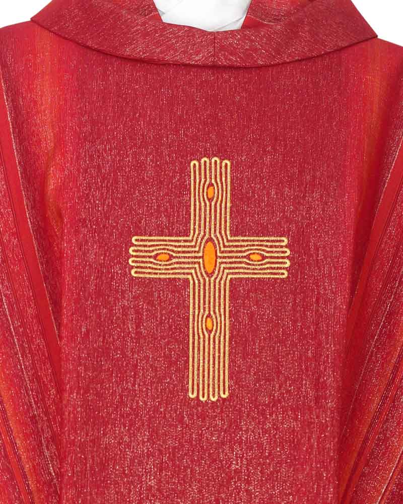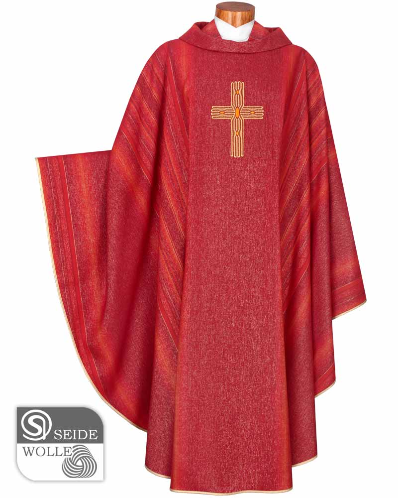 Messgewand aus fein gewebtem Paramentenstoff mit Streifendekor und Lurexfäden durchwirkt. Im Zentrum der Kasel ist ein Kreuzsymbol mit den Öffnungen des Lebens gestickt. Die 950 Gramm leichte Kasel ist ungefüttert und aus 70% Wolle mit 30% Seide gearbeitet, waschbar bei 30 Grad. Konfektion 135 cm lang und 180 cm breit, mit umgelegtem Rundkragen, inkl. Stola.