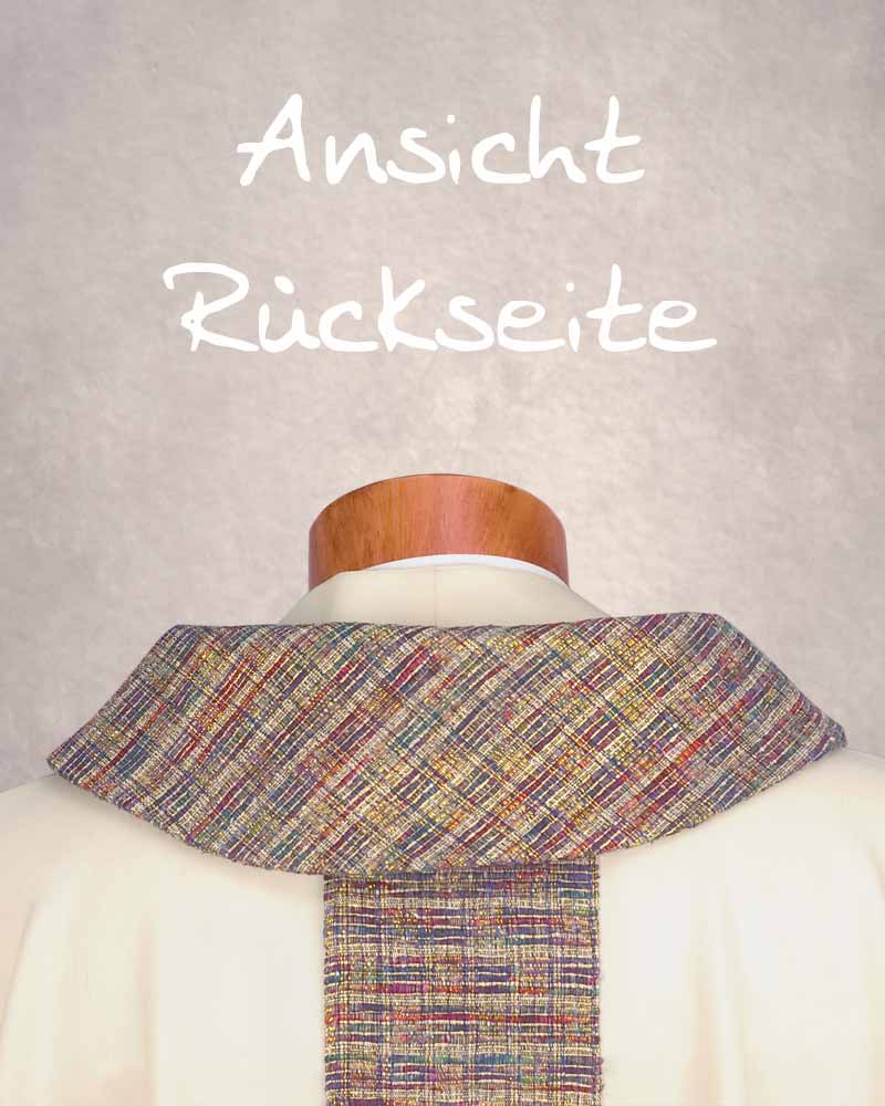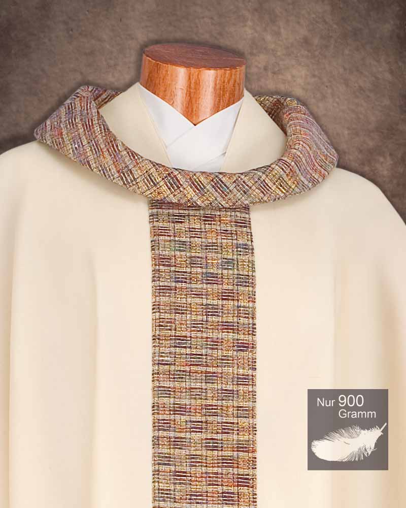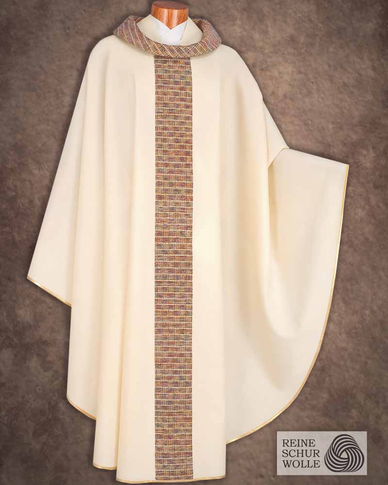 Messgewand weiß, aus leichtem Paramentenstoff in 100% Wolle, auch bei warmen Temperaturen angenehm zu tragen. Der umgelegte Schalkragen und der Mittelstab sind aus einem golddurchwirkten Seidenapplikationsstoff gearbeitet, Konfektion 130 cm lang, mit Innenstola.