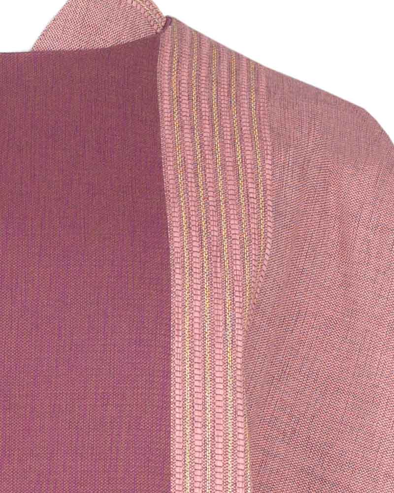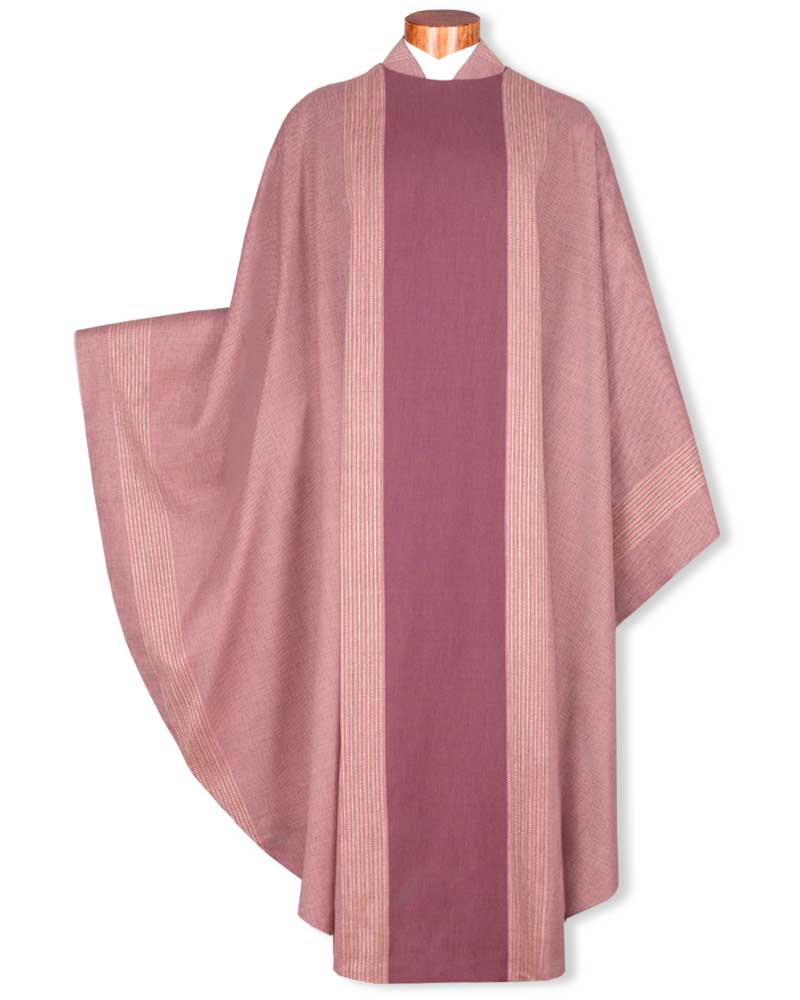 Messgewand aus knitterarmem Paramentenstoff in 80 % Wolle, 18 % Polyester und 2% Lurex. Eingewebtes Goldstreifendekor mit dunkel abgesetztem Mittelstab. Hochwertige Konfektion aus deutschem Atelier, 138 cm lang und 15 cm breit. Größzügig weiter Schnitt mit Schulterreißverschluss, gefüttert mit Seidenponge. Lieferung mit passender Innenstola.