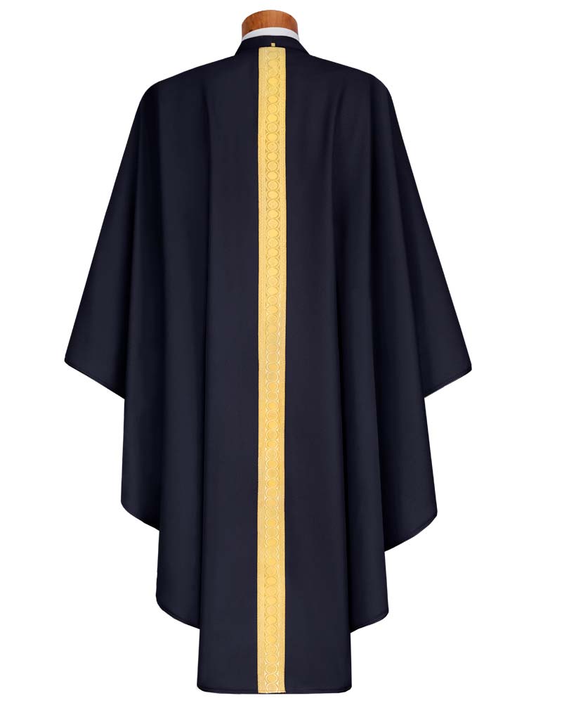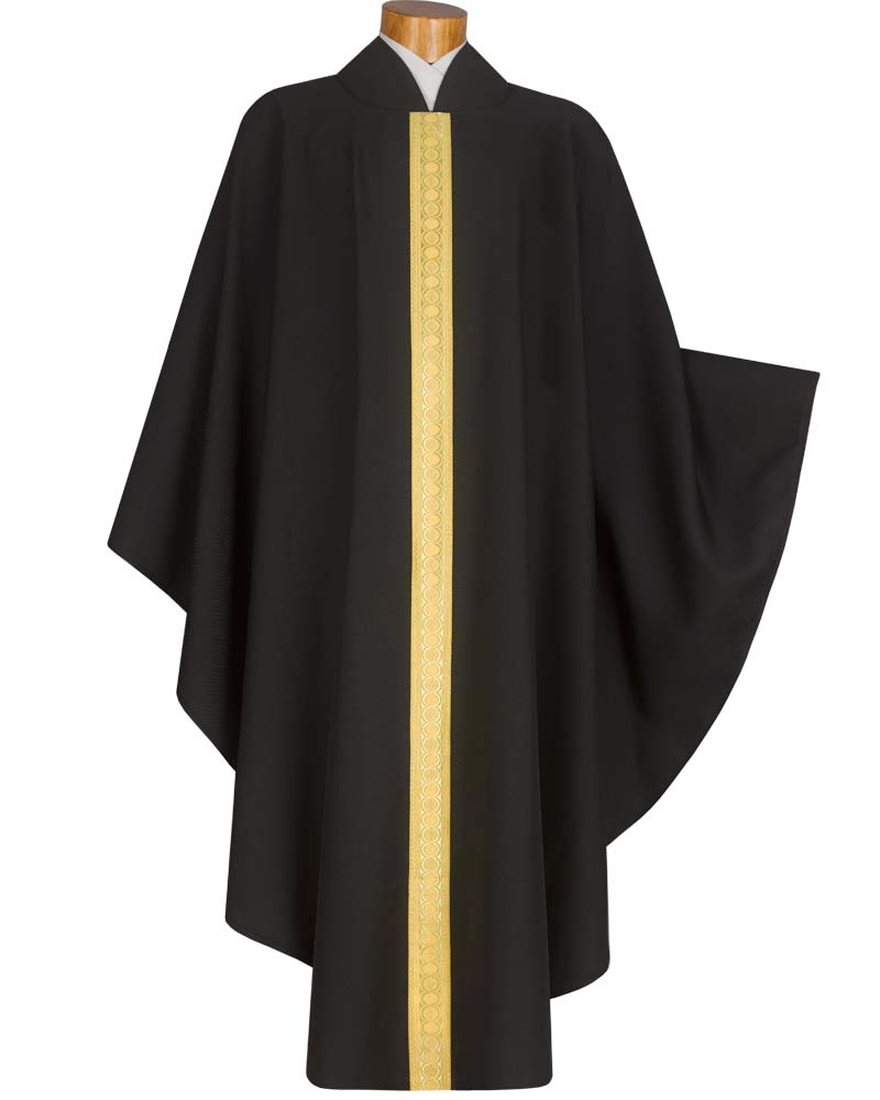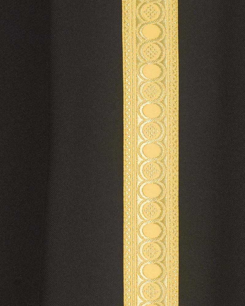 Kasel schwarz, in schlichter Ausführung, 130 cm lang, 153 cm breit. Der leichte Paramentenstoff aus 90% Polyester und 10% Wolle ist knitterarm, strapazierfähig, und ist mit 30° waschbar. Die Kaselvorder- und Rückseite ziert eine goldene, aufgenähte Bordüre. Konfektion mit gotischen Schnitt, inklusive Innenstola und ohne Kragen.