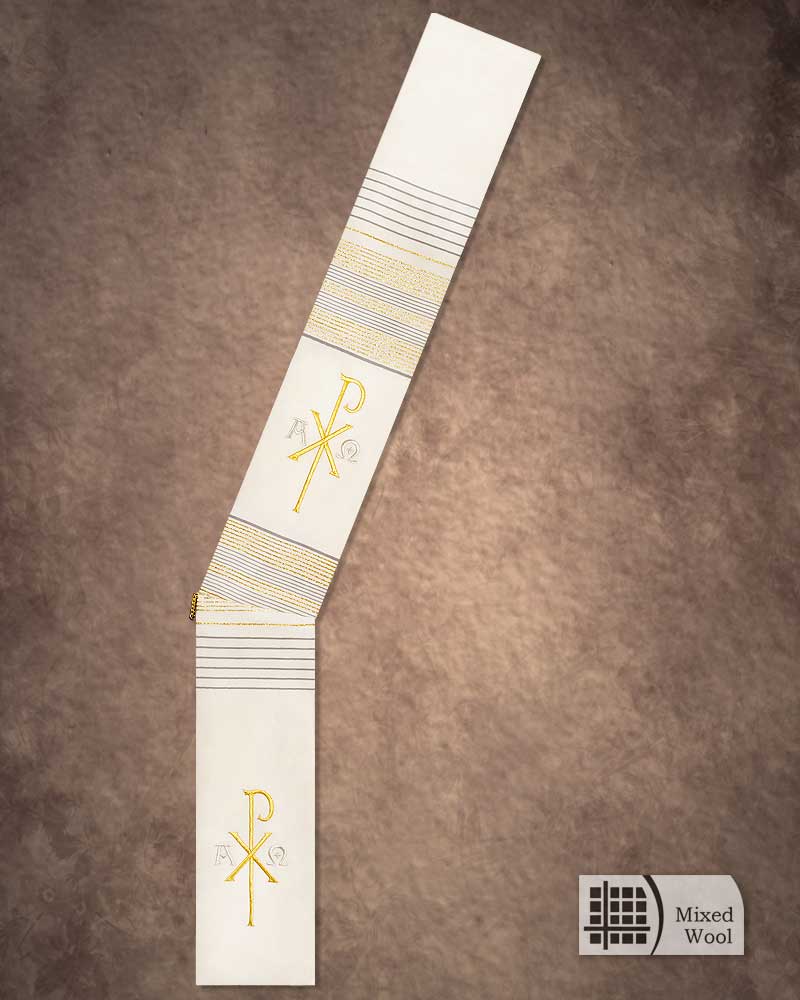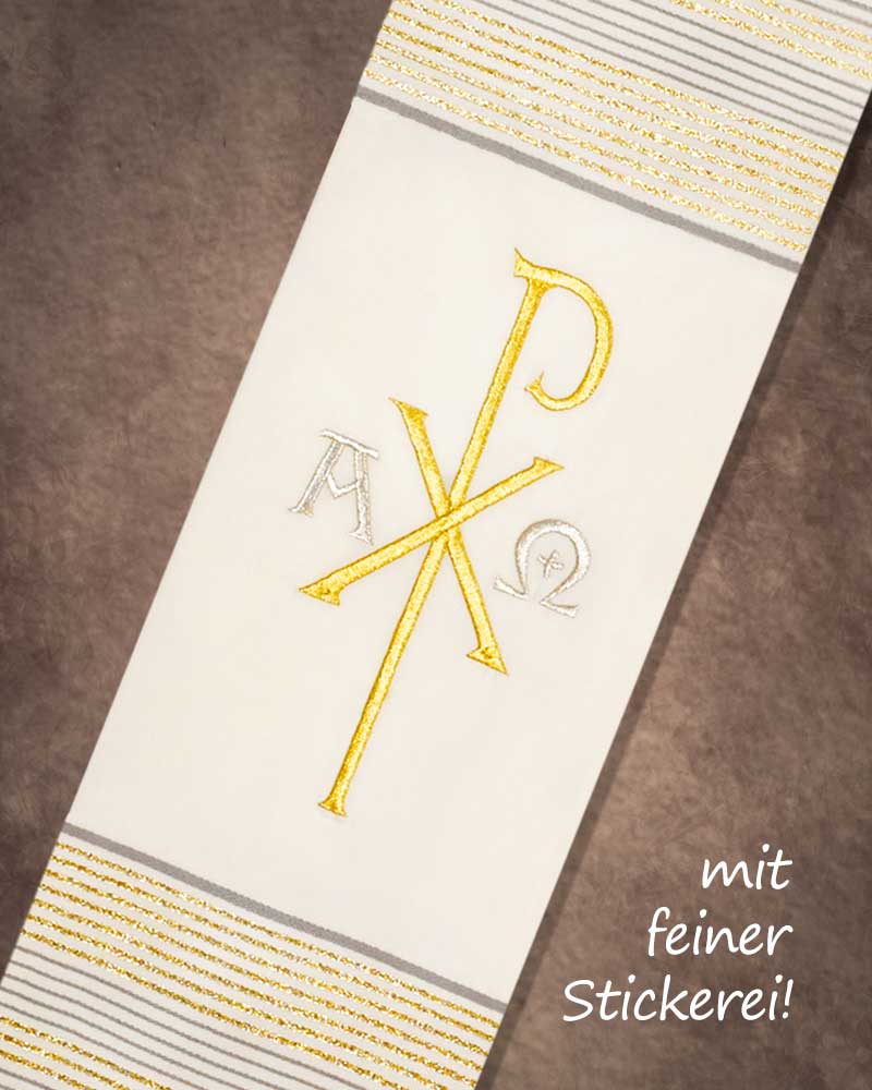 Diakonstolen, gefertigt im praktischen Faconschnitt. Feiner Paramentenstoff aus 94% Schurwolle, 6% Metallfäden, mit Streifeneinwebe. Die Symbolik Pax und A+O ist aus feinen Goldfäden gestickt, 130 cm lang.