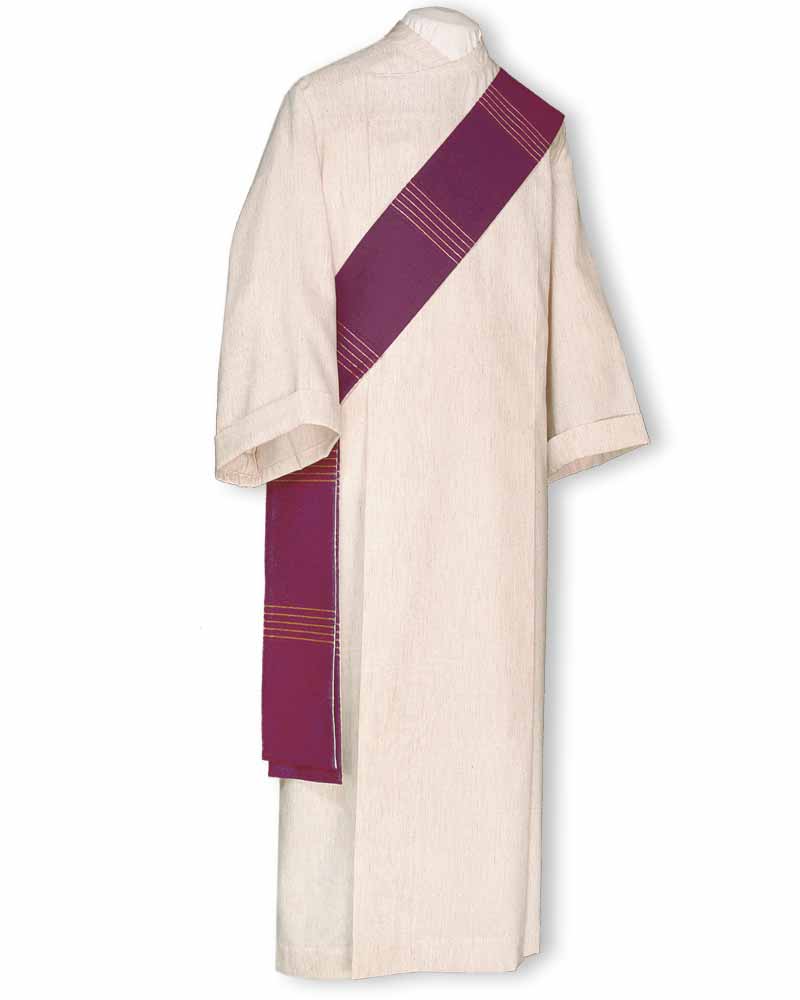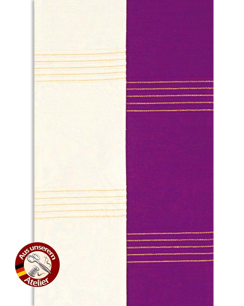 Diakonstola weiß/violett aus 80% Wolle, 18% Polyester, 2% Lurex, mit eingewebten Dekorstreifen, 160cm lang, doppelseitig konfektioniert.