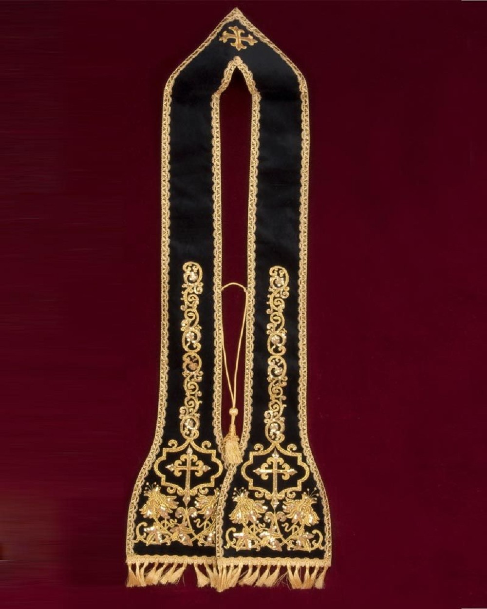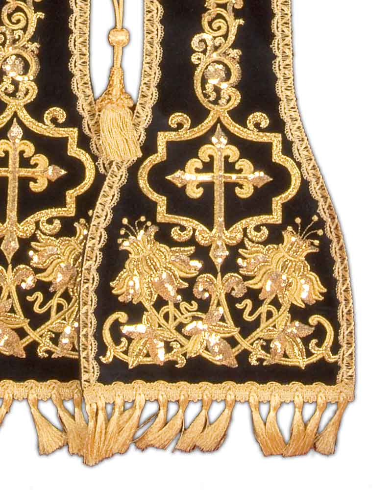 Predigtstola schwarz, in traditionell konischem Schnitt, wertvolle Goldstickerei mit Paillettenbesatz, 110 cm lang. Mit Stolagehänge und Fransen. Gewebe aus 60% Polyester, 30% Acryl, 10% Lurex.