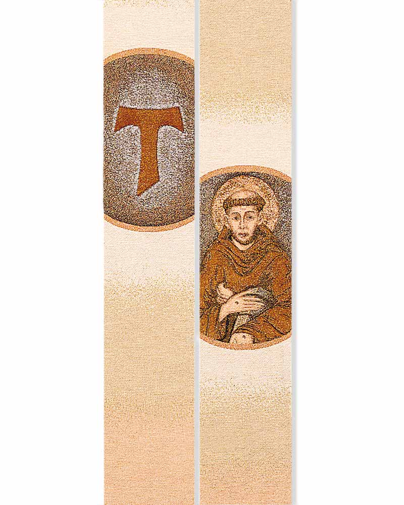 Stola "St. Franziskus". Die eingewebten Bildmotive sind Nachbildungen byzantinischer Vorbilder. Der Gobelinstoff aus 45% Baumwolle, 45% Polyester, 10% Lurex und sonstige Fasern, ist knitterarm und pflegeleicht. Konfektion in 140cm Länge und 14,5 cm breit. Stolen lassen sich beliebig mit Messgewändern in allen liturgischen Farben kombinieren.