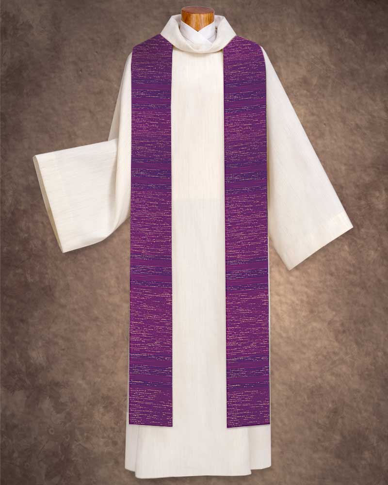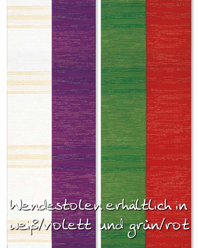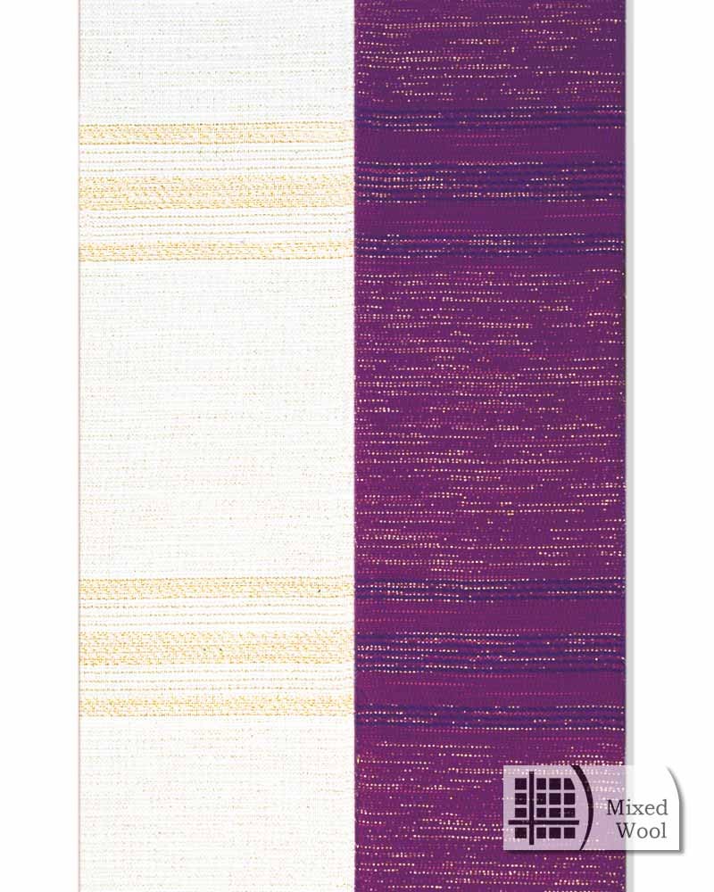 Doppelstola aus handgewebtem Trevira-/Wollgewebe (80% Wolle, 15% Polyester, 5% Lurex), strapazierfähig und knitterarm, dezente Streifeneinwebe mit Lurexfäden, 160 cm lang. Doppelstola weiß/violett