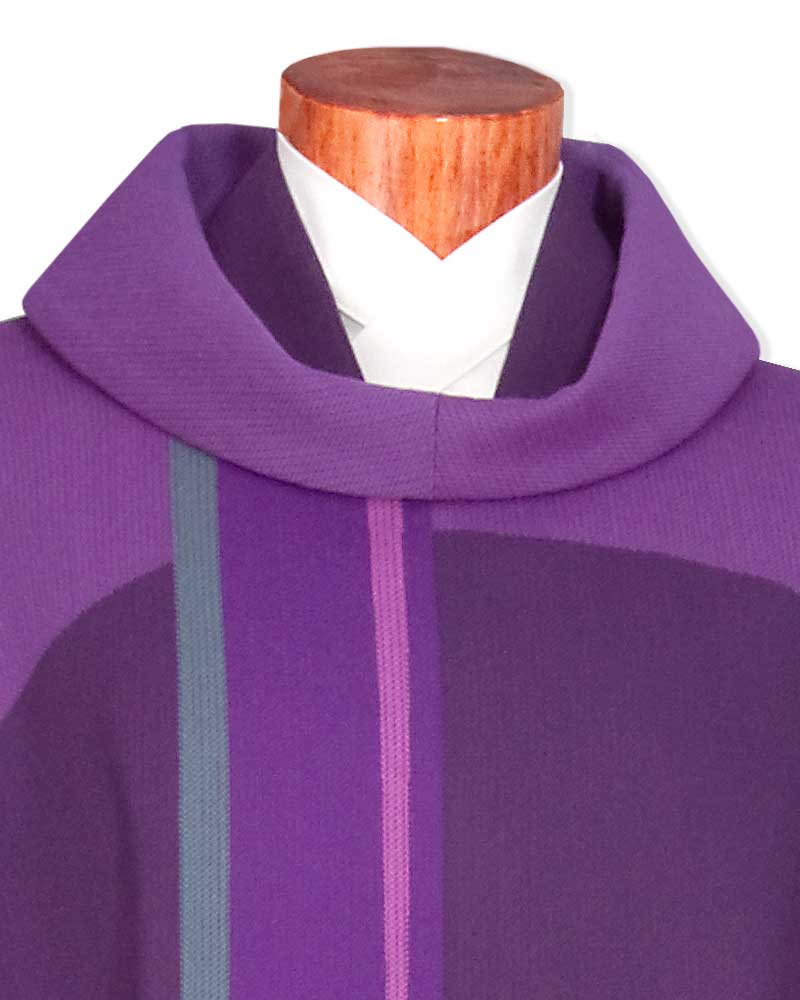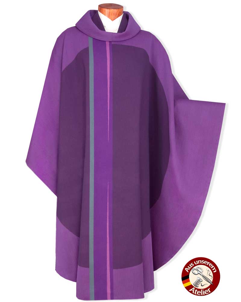 Messgewänder mit eindrucksvollem Lichtstreifendesign aus hochwertigem Jacquardgewebe, Konfektion mit umgelegtem Rundkragen und Innenstola, 138 cm lang. Der strapazierfähige und knitterarme Paramentenstoff aus 70% Wolle und 30% Polyester, ist mit Seidenponge abgefüttert. Kasel violett.