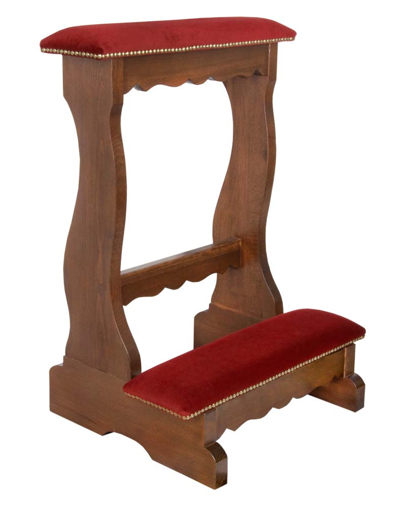 Betstuhl in solider Massivholzausführung, braun gebeizt, geschwungene Formgebung, 60 cm breit, 84 cm hoch, 50 cm tief, Arm und Kniepolster mit rotem Samtbezug.