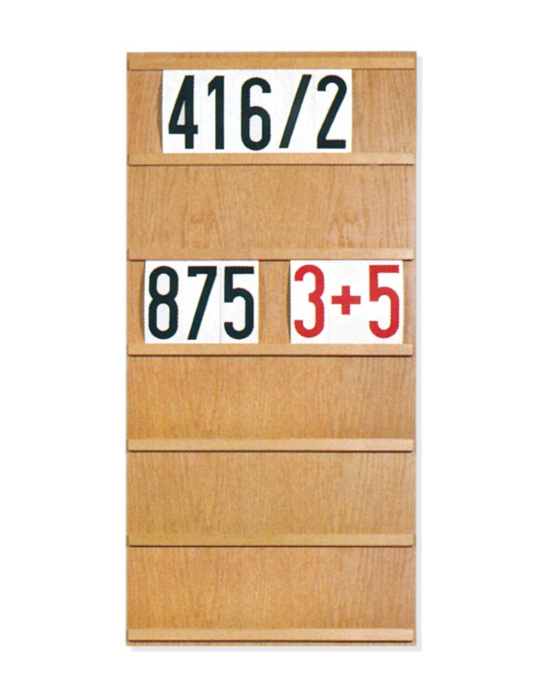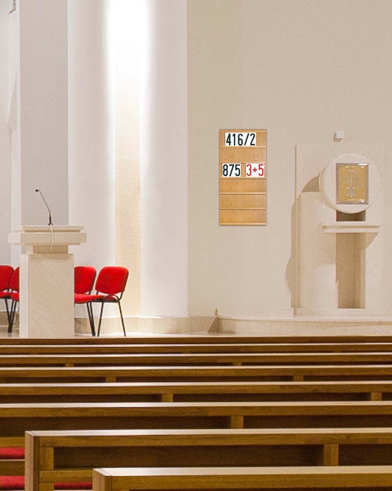 Liednummerntafeln für Ständer oder Wandbefestigung. Eiche natur, 50 cm breit, Höhe je Zeile 17 cm. Der Zeilenabstand ist kleiner als die Liednummerziffern. So werden die Täfelchen leicht gewölbt eingesteckt, damit auch bei ungünstigen Lichtverhältnissen keine Spiegelung entsteht. Pro Zeile erhalten Sie acht Nummerntäfelchen und pro Tafel ein Aufbewahrungskästchen mit 12 Sortierfächern. 6-zeilig für 48 Liednummern.