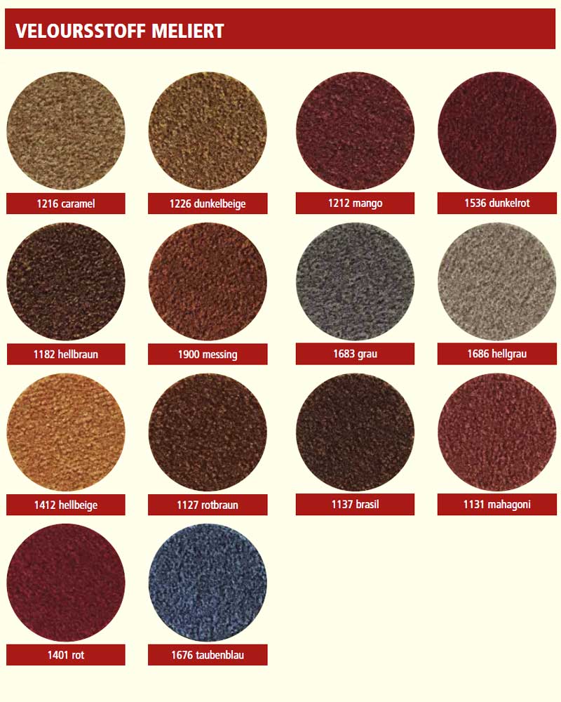 Der Bezug aus hochwertigem Velourstoff ist pflegeleicht und strapazierfähig. Er ist in drei verschiedenen Stoffgruppen und zahlreichen Farben erhältlich. Velourstoff der höchsten Stoffgruppe, 100% Polyamid 6.6, extrem strapazierfähig, schmutzabweisend durch Faserimprägnierung, B1 schwer entflammbar, Gewicht: 975 g/lfm (Breite 150cm).