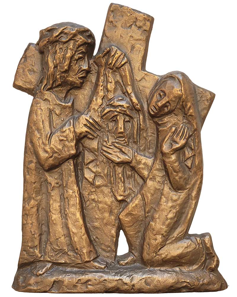 Diese Bronzeplakette Kreuzwegstation Veronika 24 x 33 cm zeigt Veronika, wie sie Jesus das Schweißtuch reicht – gemäß der 6. Station des Kreuzwegs. Die Tafel ist aus hochwertiger Bronze gefertigt, mit feiner Reliefstruktur, wetterfester Oberfläche und einem Gewicht von 2,5 kg. Maße: 24 cm Breite × 33 cm Höhe. Rückseitig mit Vorrichtung zur Aufhängung über Gewindeschrauben oder Haken. Lieferung inklusive Befestigungsmaterial. Das Motiv steht symbolisch für Mitgefühl und Demut im Leiden Christi.