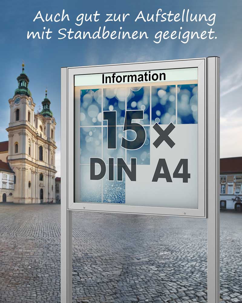 Der silber eloxierte Schaukasten aus Aluminium, 1810 x 1130 x 65 mm (Außenmaß), bietet Platz für 24 DIN-A4-Seiten. Mit ESG-Sicherheitsglas, wetterfester Konstruktion eignet er sich für Innen- und Außenbereiche. Die silberne Magnethafttafel inklusive 10 Magneten ermöglicht eine einfache Befestigung von Dokumenten. Ein Sicherheitsschloss mit 2 Schlüsseln schützt vor unbefugtem Zugriff, während Gasdruckfedern das Öffnen erleichtern. Wand- oder Ständermontage sind möglich. Geliefert in bruchsicherer Kartonage, überzeugt der Schaukasten mit 10 Jahren Garantie und langlebiger, korrosionsbeständiger Qualität. Ideal für professionelle Präsentationen.