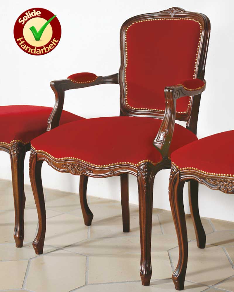 Mittelsedilie barock geschnitzt und gebeizt. Arm- und Rückenlehne sind mit dunkelrotem Samt überzogen, ebenso die mit Federkern gepolsterte Sitzfläche.