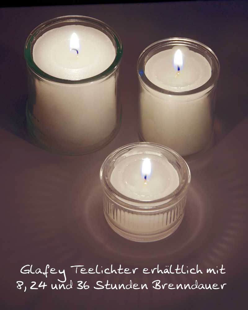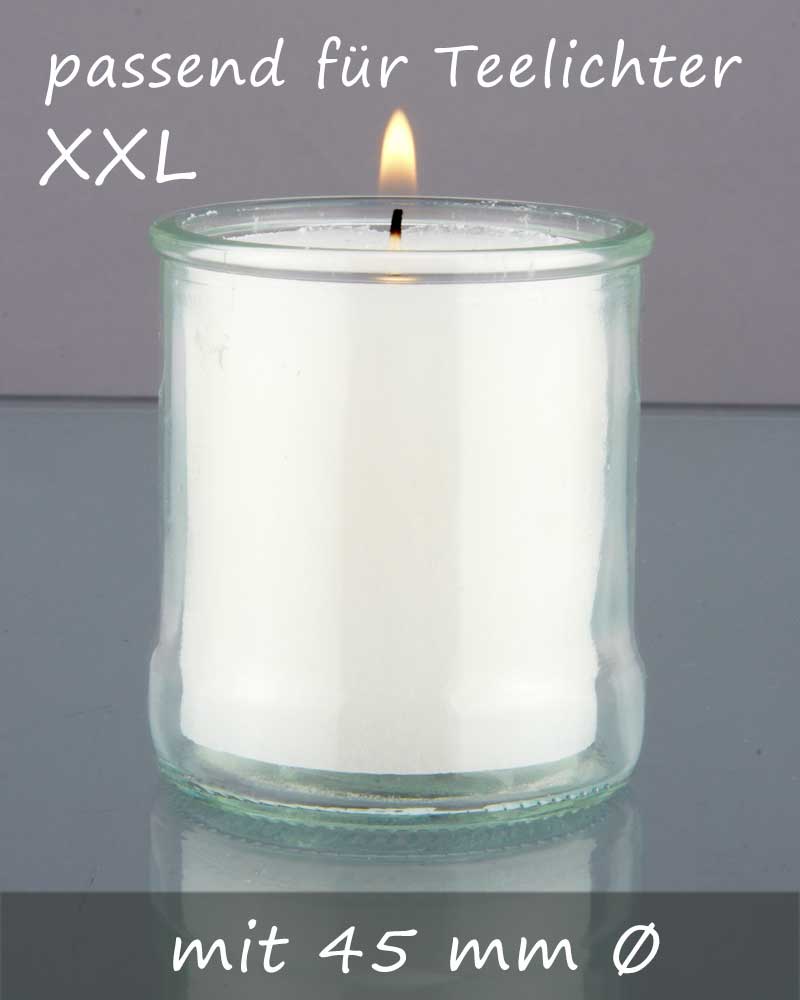 Lichtglas hitzebeständig, aus transparentem Glas, 55 mm Ø, 60 mm hoch. Gut geeignet für Glafey-Teelichter mit 36 Std. Brenndauer Art. 222614. Lieferung ohne Teelichte.