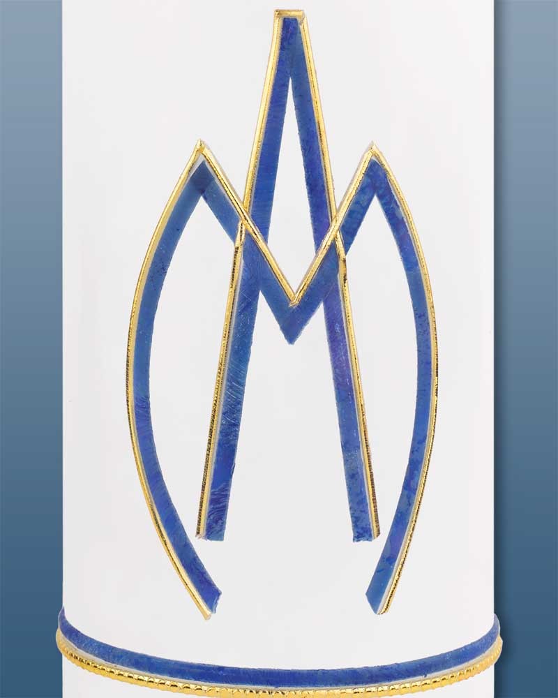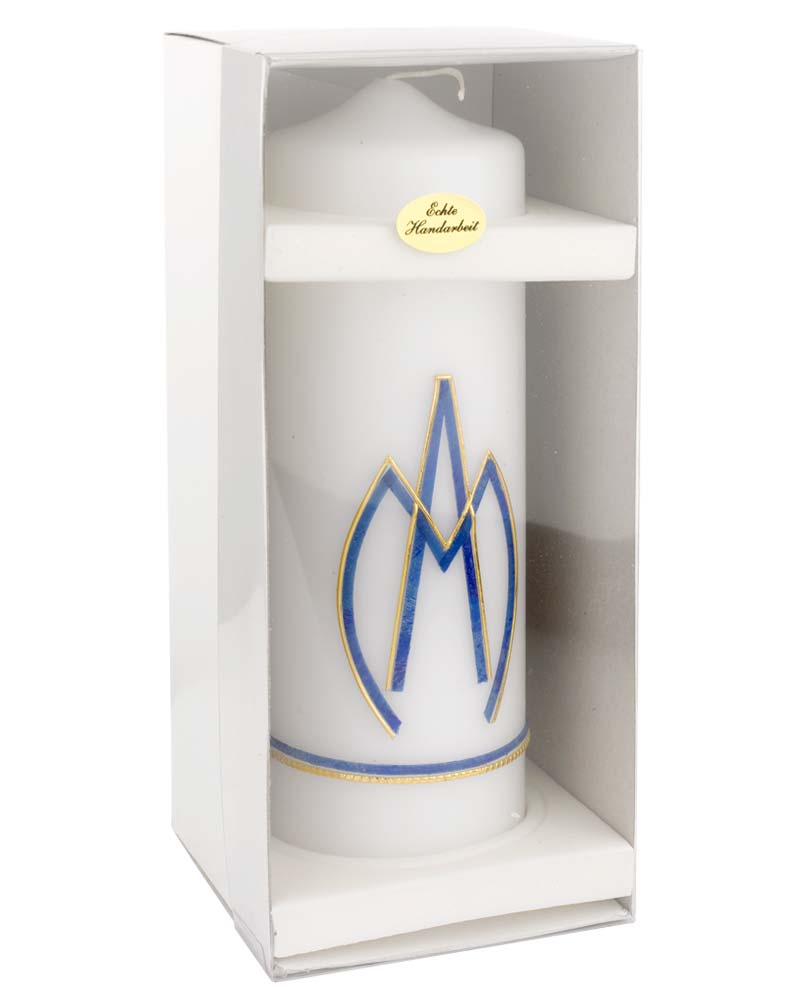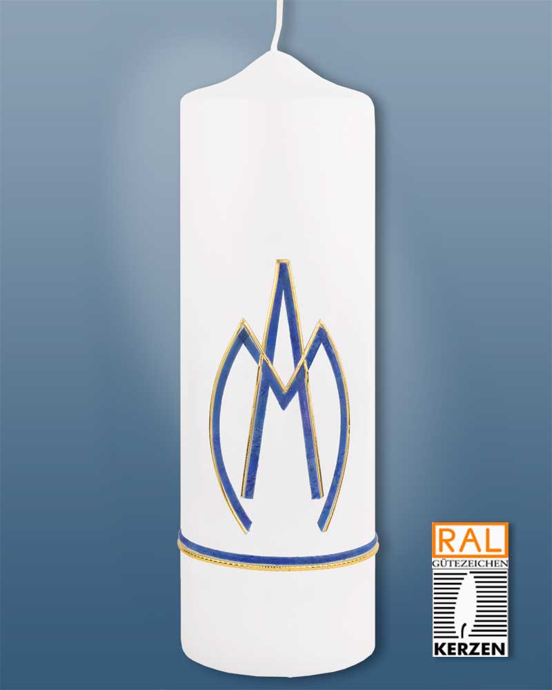 Marienkerze 225x70 mm mit blau/goldenem modernem Marienzeichen.