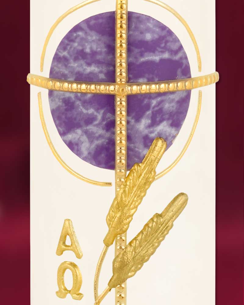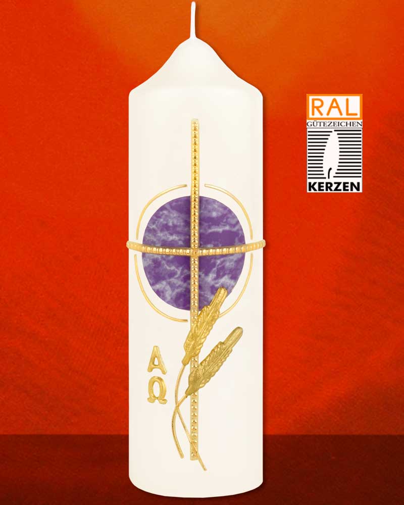 Osterkerze Tischkerze 165/50 mm, Kreuz in Gold, violetter Kreis, A+O und Ähren.