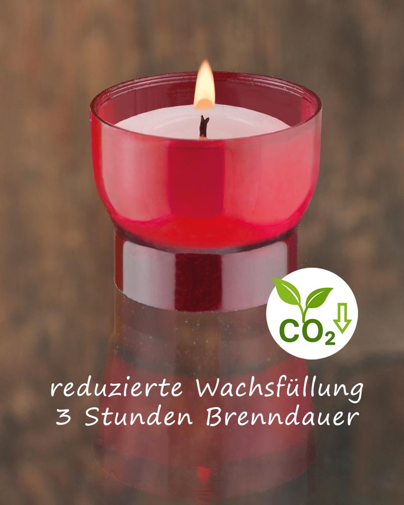 Opferkerzen aus Paraffin, mit reduzierter Füllung, 3 Stunden Brenndauer, mit roter PVC Hülle, 47 mm Ø. Der Umwelt zuliebe können diese Opferlichter einfach und schnell mit Nachfüllkerzen wieder befüllt werden. Im Karton sind 300 Lichter enthalten.
