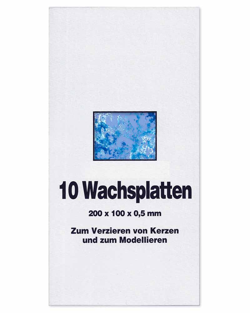 Verzierwachs, 10 Platten 200 x 100 x 0,5 mm, in marmoriertem Blau. Diese Wachsplatten eignen sich hervorragend für das Verzieren von feierlichen Festtagskerzen zur Taufe, Erstkommunion, Firmung, Ostern oder Weihnachten.