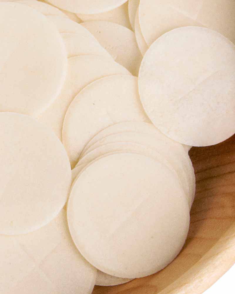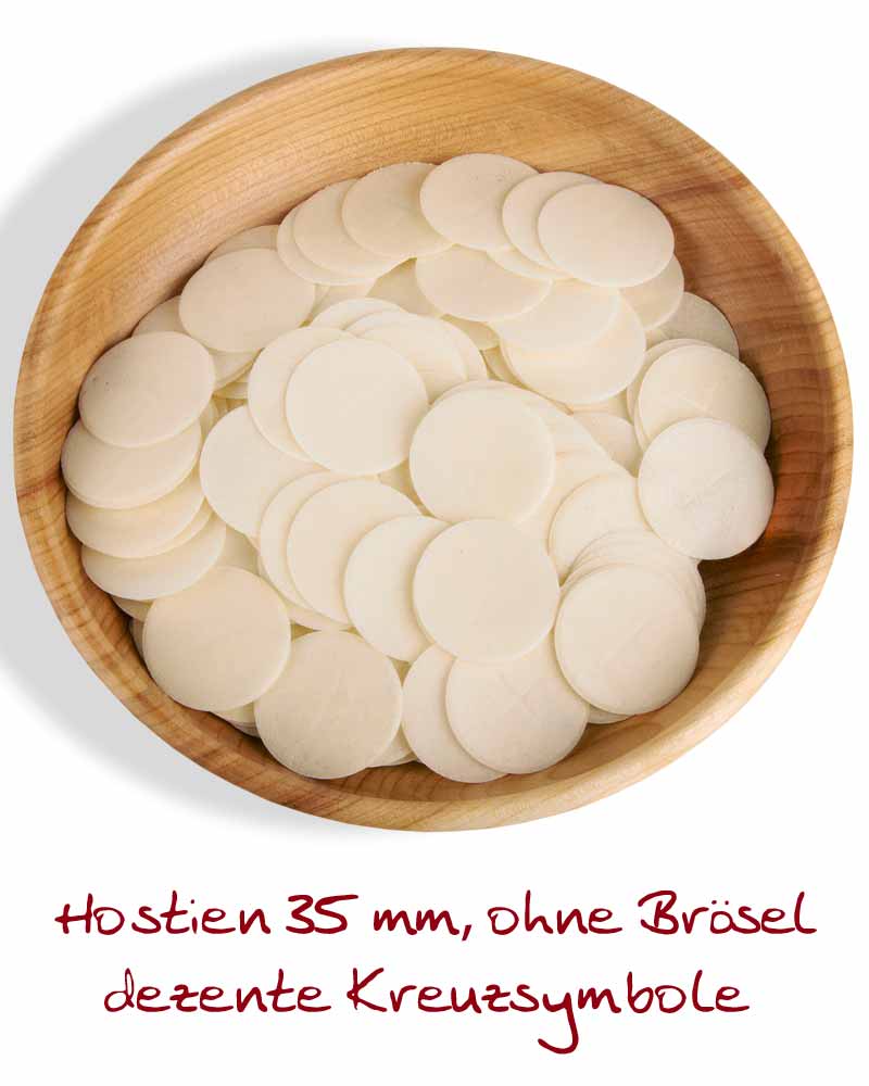 Brothostien aus reinem Wasser und Mehl, gefertigt und gebacken gemäß dem Kirchenrecht CIC 924. Die Sichtseite ist mit einem schlichten Kreuzsymbol geprägt. Die Kanten sind gerundet und fest, so dass die Hostien kaum Brösel hinterlassen. Diese Hostien für Laien haben 35 mm Durchmesser und eine Stärke von 1,2 mm. Sie erhalten 1000 Brothostien im praktischen, wiederverschließbaren Aufbewahrungsbehälter. Der Nährwert beträgt 389 Kilokalorien pro 100 Gramm.