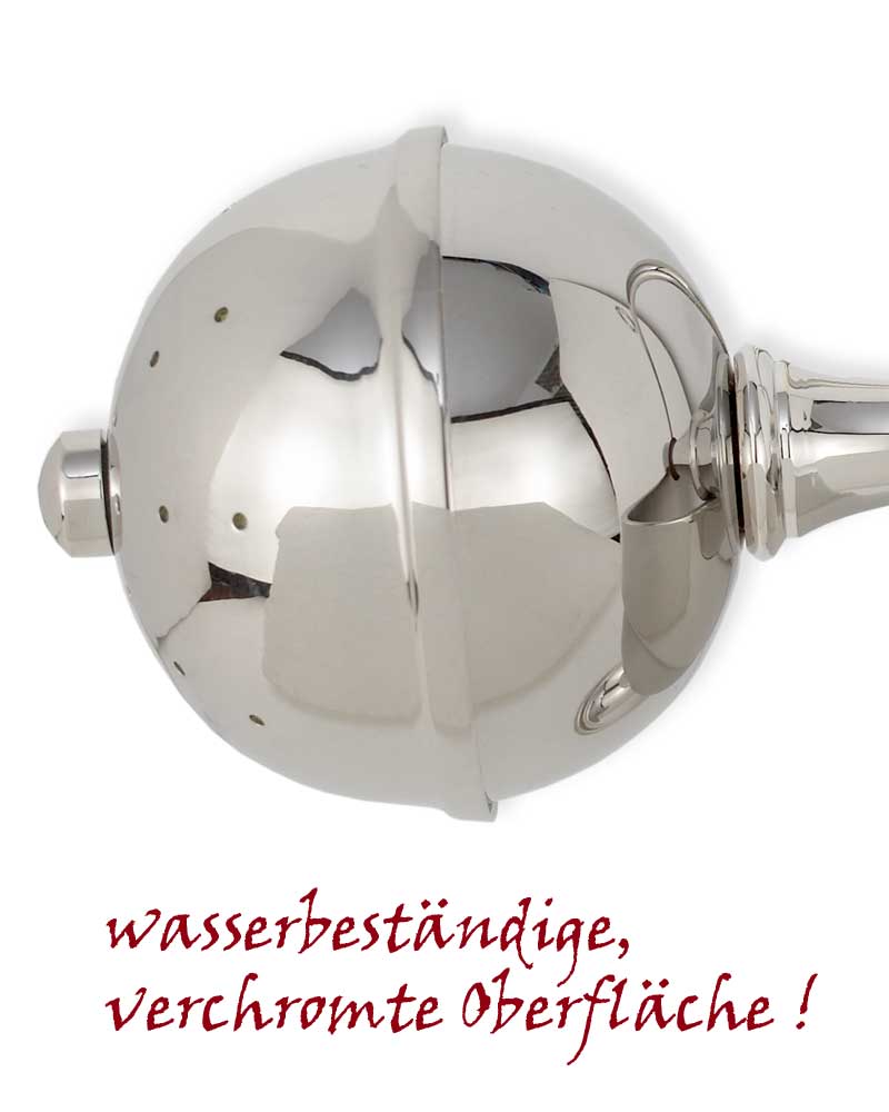 Aspergill in solider Messingausführung und braunem Holzgriff, 30 cm lang, mit Ring zum trockenen 35 cm lang. Die Oberfläche ist verchromt und somit widerstandfähig gegen Kalk, Rost und Wasserflecken.