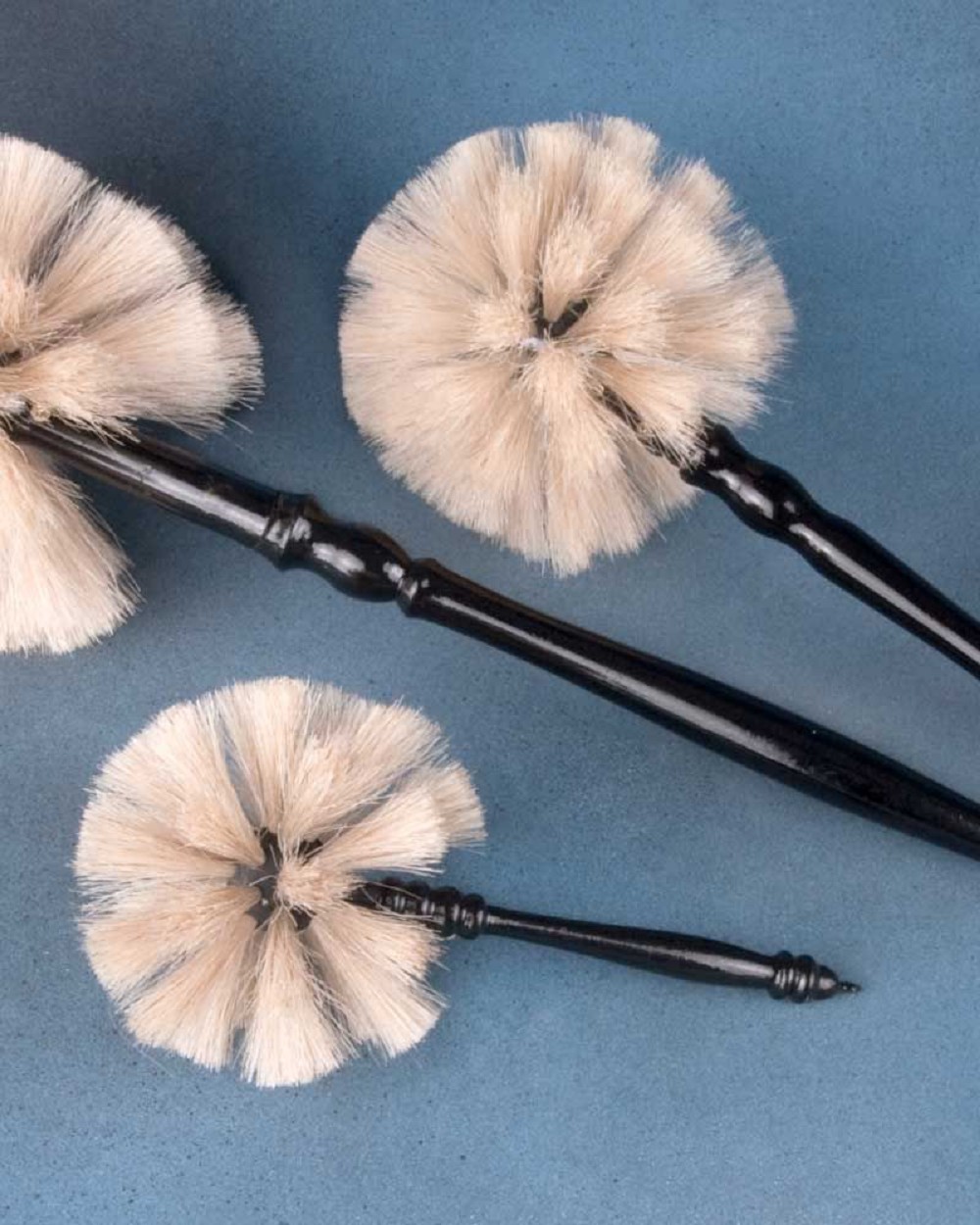 Borstenwedel mit Naturborsten. Holzgriff schwarz lackiert. Borstenwedel 17 cm mit Aufhängeöse. 17 cm langer Griff + 4 cm Borsten = 21 cm Gesamtlänge. Borsten ca. 11 cm Ø