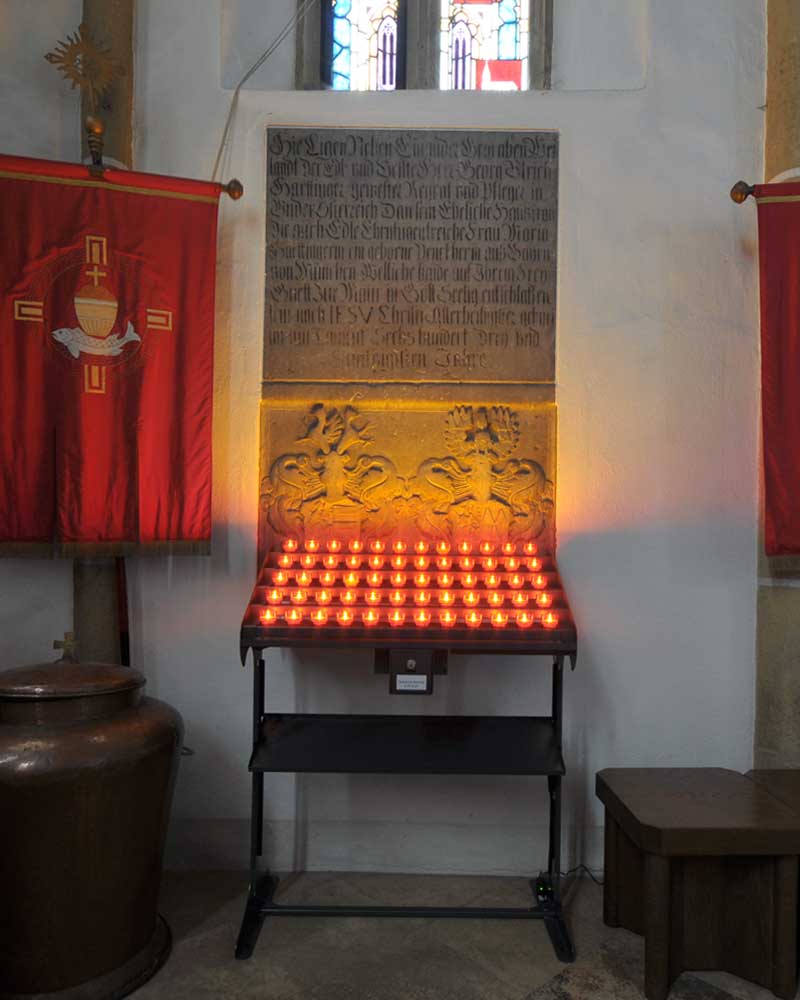 LED Opferlichttisch mit Kerzenablage, solide Stahlausführung, schwarz pulverbeschichtet, 230 V Stromversorgung, Opferstock mit Zylinderschloss. Opferlichttisch inclusive 30 rubinrote LED Kerzen. Auf Wunsch können die LED Opferlichter auch bernsteinfarbig geliefert werden.