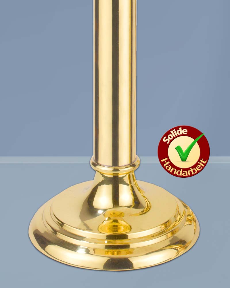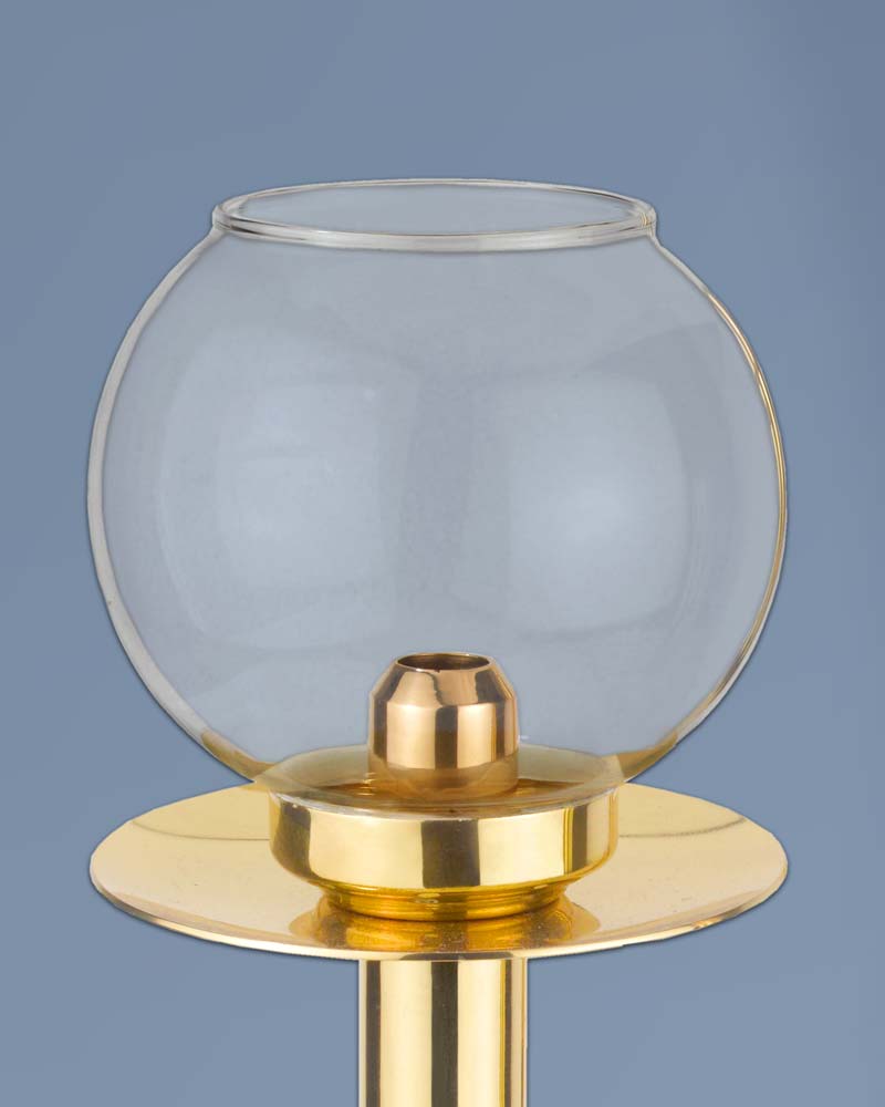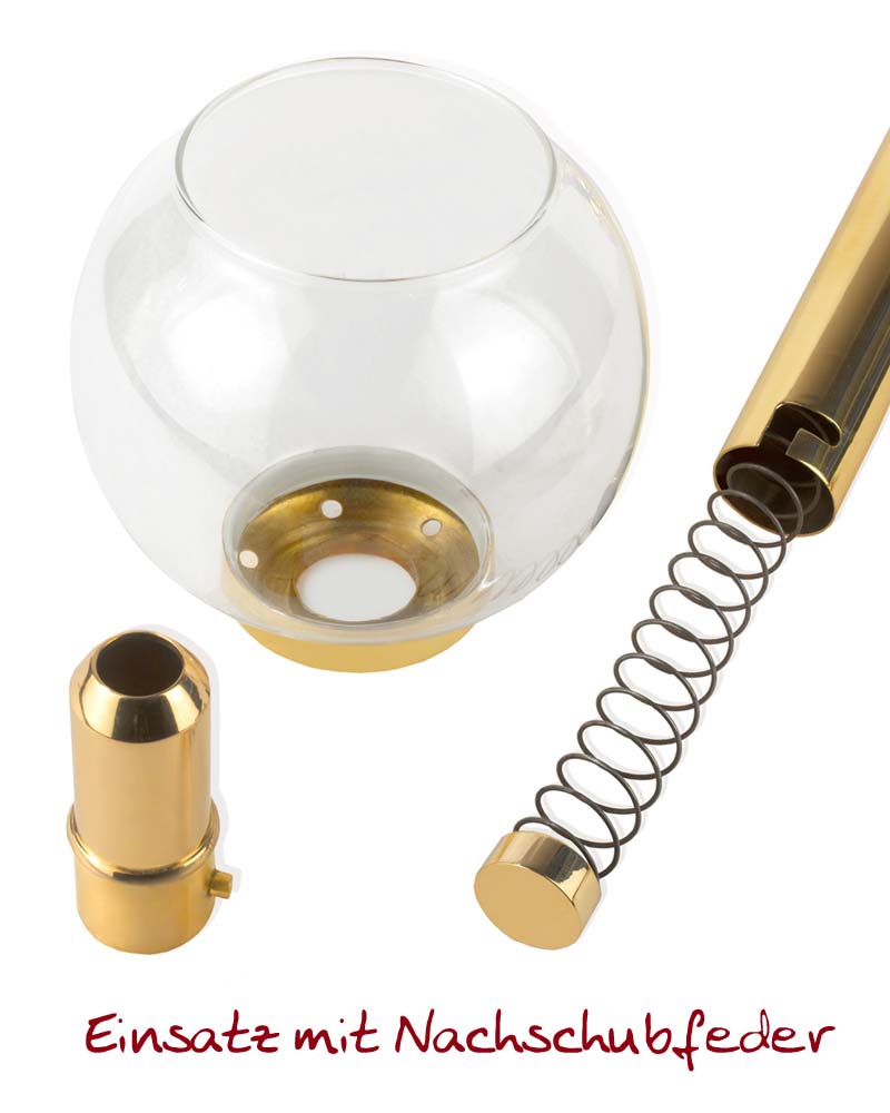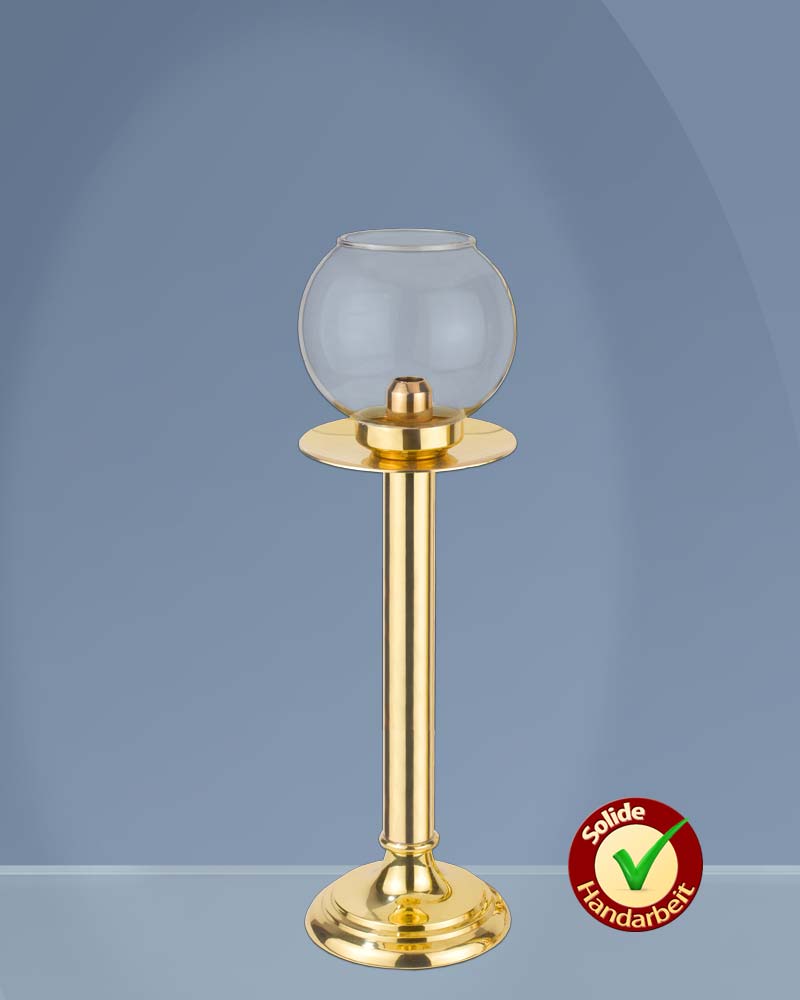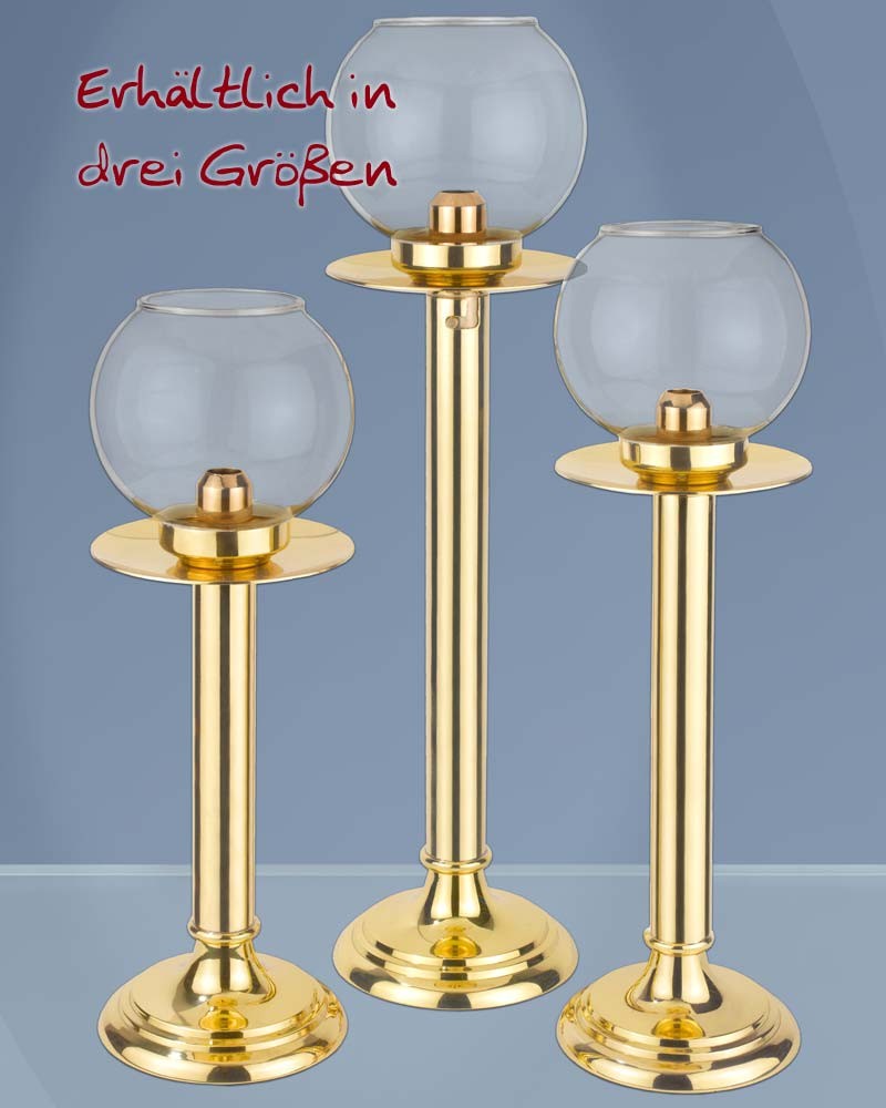 Windlichter aus poliertem Messing, anlaufgeschützt, mit Leuchterschale und standfestem Fuß mit 13 cm Ø. Das abnehmbare Kugelglas schützt die Flamme effektiv vor Wind. Durch eine Nachschubfeder werden die Einsatzkerzen im Inneren nach oben geschoben, was einen tropffreien Abbrand ermöglicht. Windlicht, mit Kugelglas, 50 cm hoch, 925 Gramm.