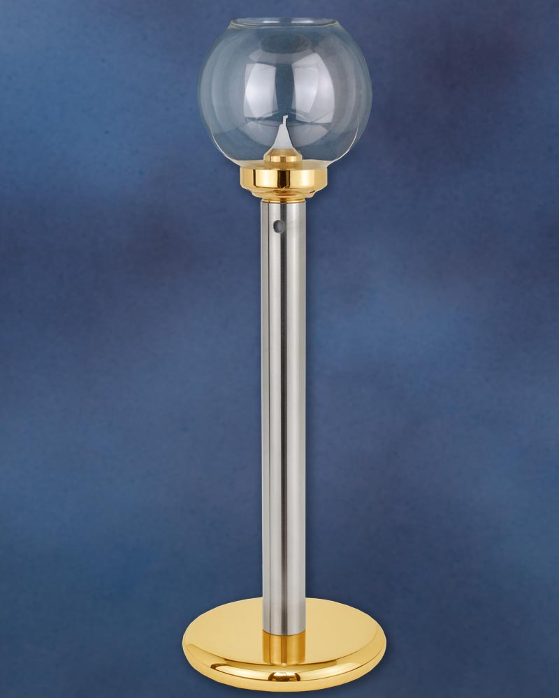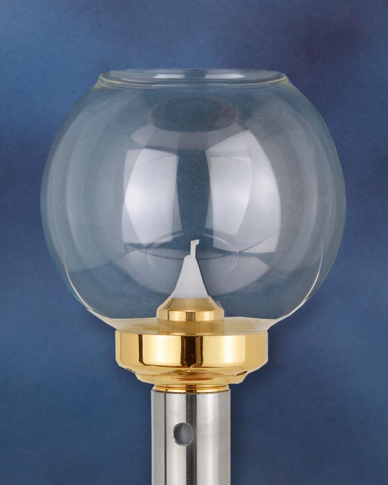 Flambeaux mit Windschutzglas, aus robustem Edelstahl, 40 cm hoch. Ein fest angearbeiteter Fuß aus poliertem Messing gibt dem Windlicht einen sicheren Stand. Durch ein Federsystem wird im Inneren des Leuchterschaftes die Kerze automatisch nach oben geschoben. Das Flambeaux kann als Standleuchter oder Tragefackel, für Prozessionen Verwendung finden. Es passen Einsatzkerzen bis 21 mm Ø in den Schaft.