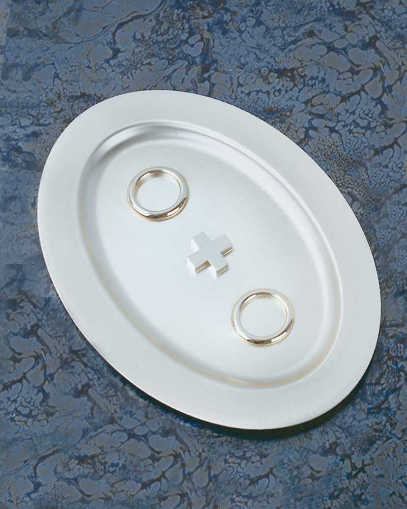 Trauringtablett aus Messing, versilbert, 16,5 x 23,5 cm breit. Mittig befinden sich Wölbungen zum Einlegen der Ringe, die das Verrutschen der Ringe verhindert, dazwischen ist das Tablett mit einem Kreuz belötet. Tablett zur ehrwürdigen Präsentation der Eheringe.