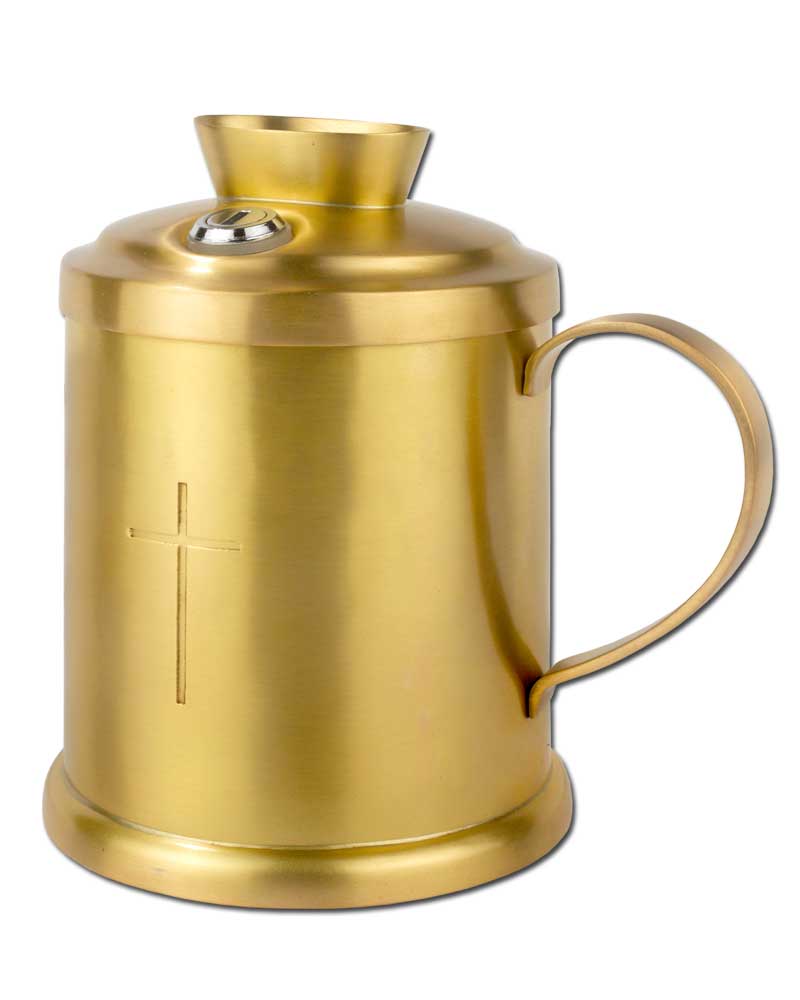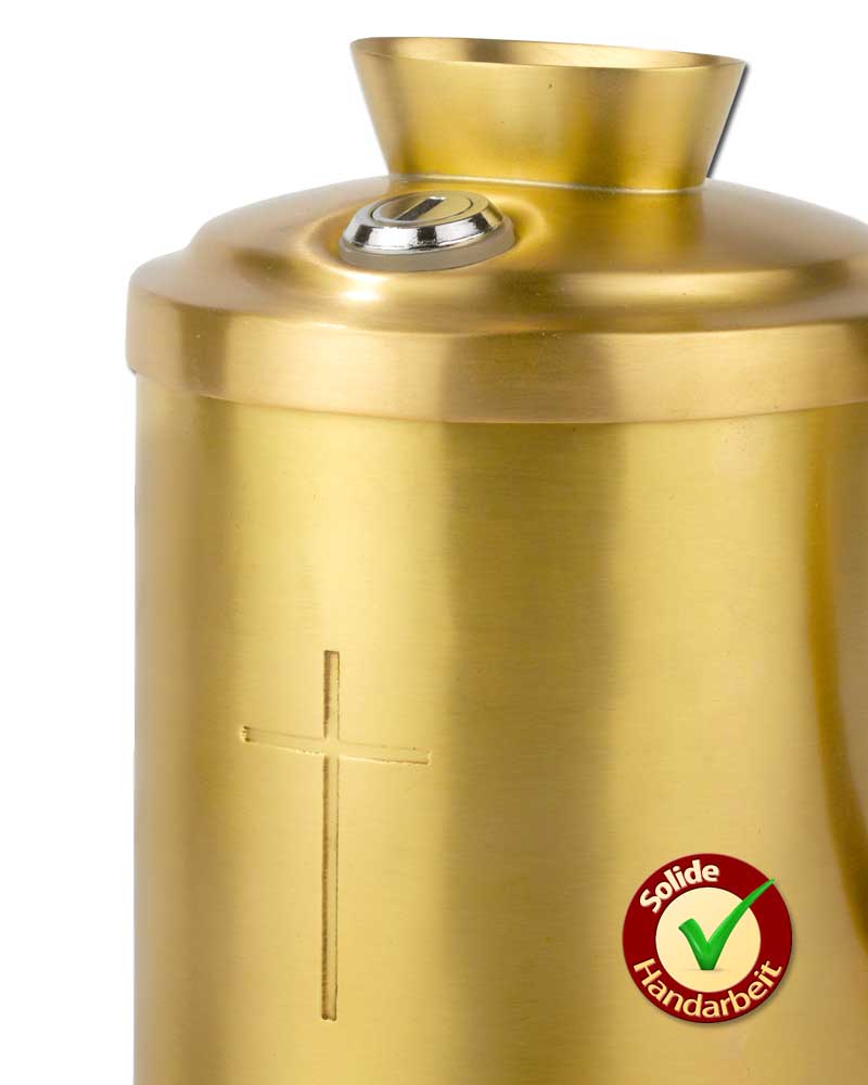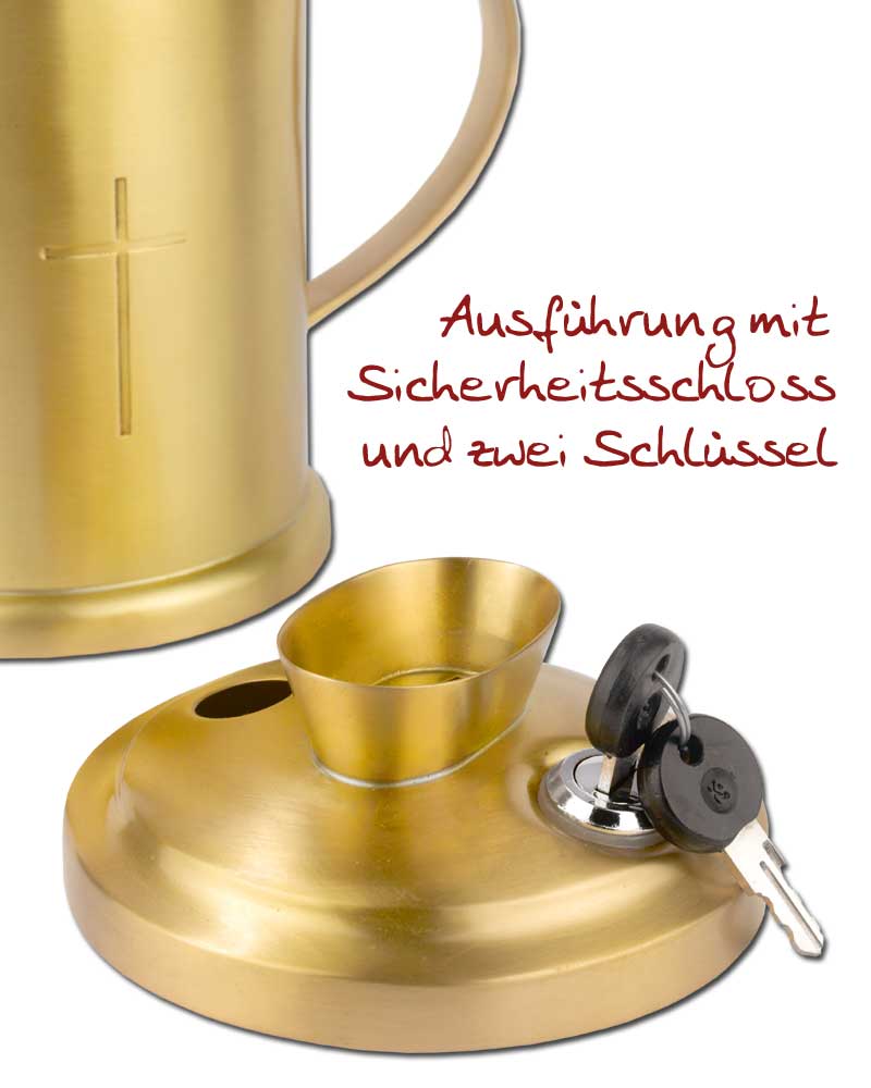 Opferbüchse in robuster Messingausführung, 11 cm Ø, 15 cm hoch, angefertigt in solider Handarbeit. Die satinierte Oberfläche ist anlaufgeschützt und unempfindlich gegen Fingerabdrücke. Auf Vorder- und Rückseite ist ein schlichtes Kreuzsymbol eingearbeitet. Neben einem großen Einwurfschlitz für Münzen ist auch eine runde Öffnung für Geldscheine im Deckel eingearbeitet. Für das Sicherheitsschloss liegen zwei Schlüssel bei. Ein großer Griff sorgt für einen sicheren Halt.