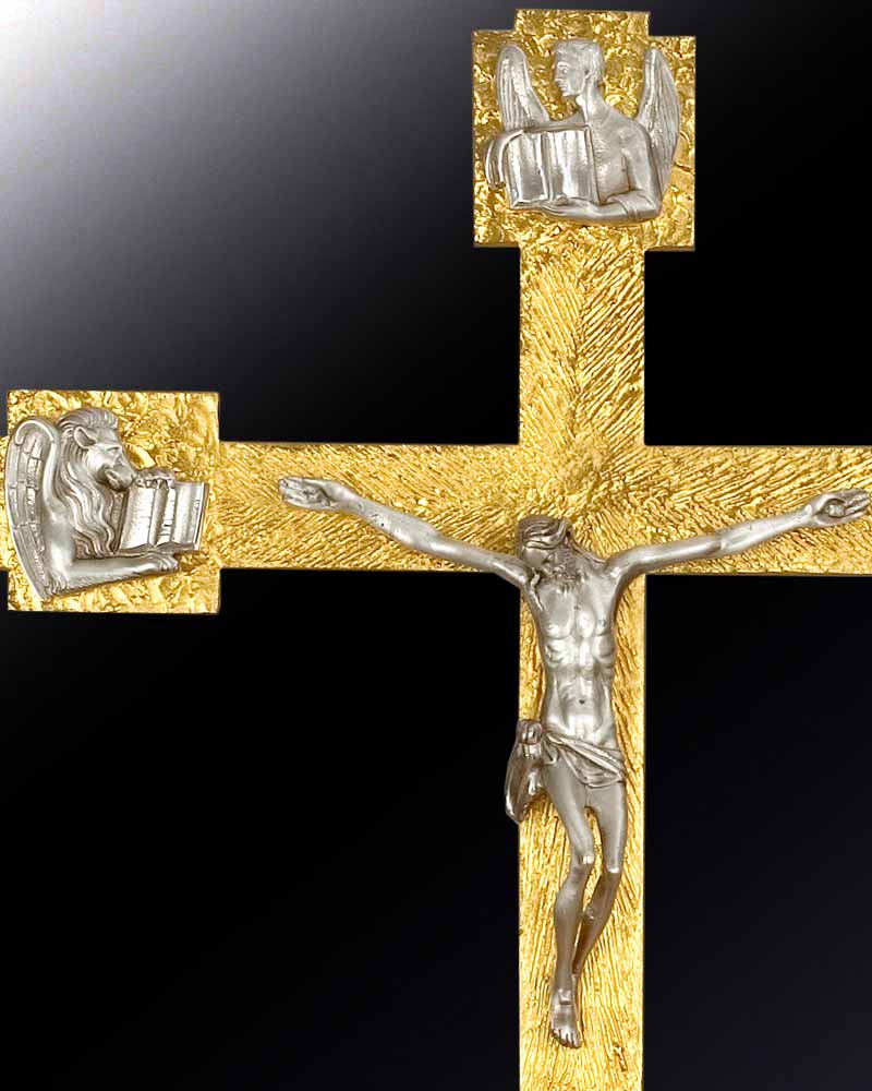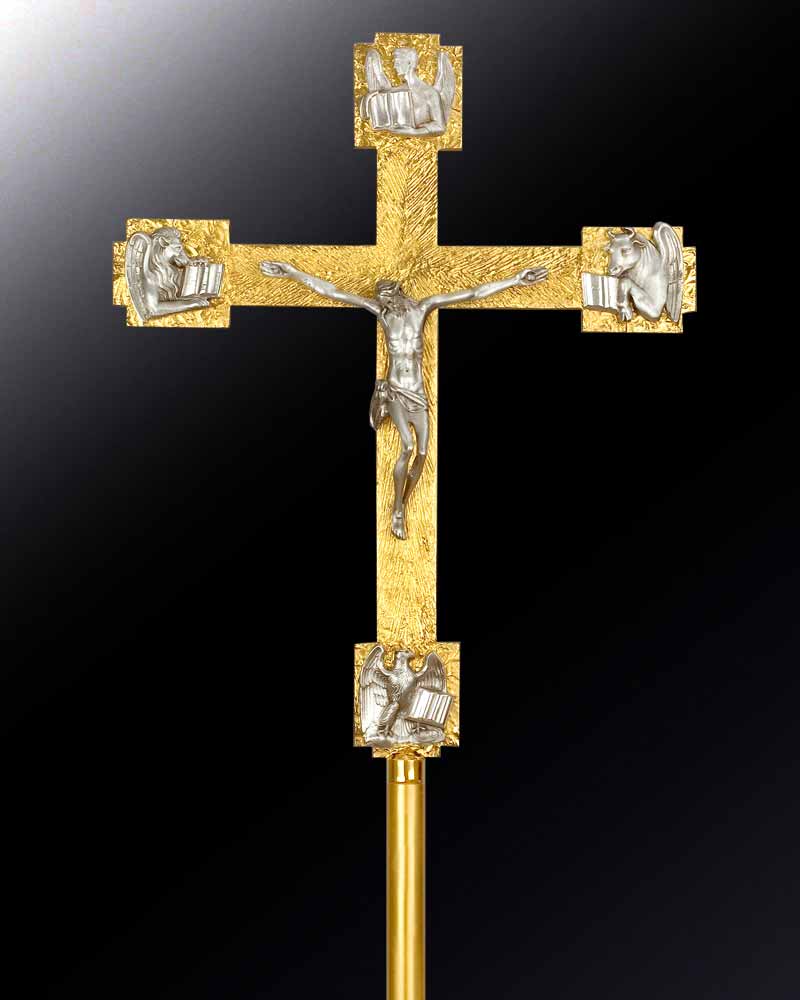 Vortragekreuz 47 x 37 cm, vergoldet mit versilbertem Korpus und Symbolen der vier Evangelisten. Mit zerlegbarer Stange.