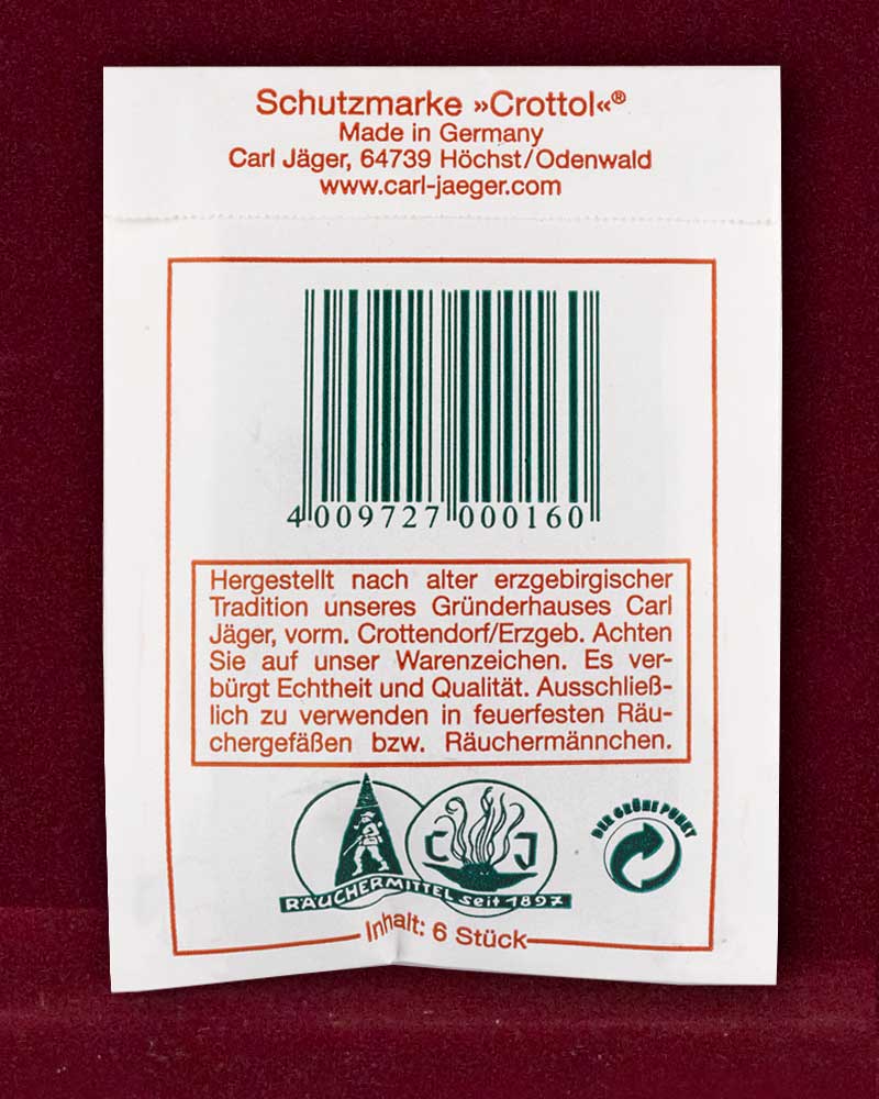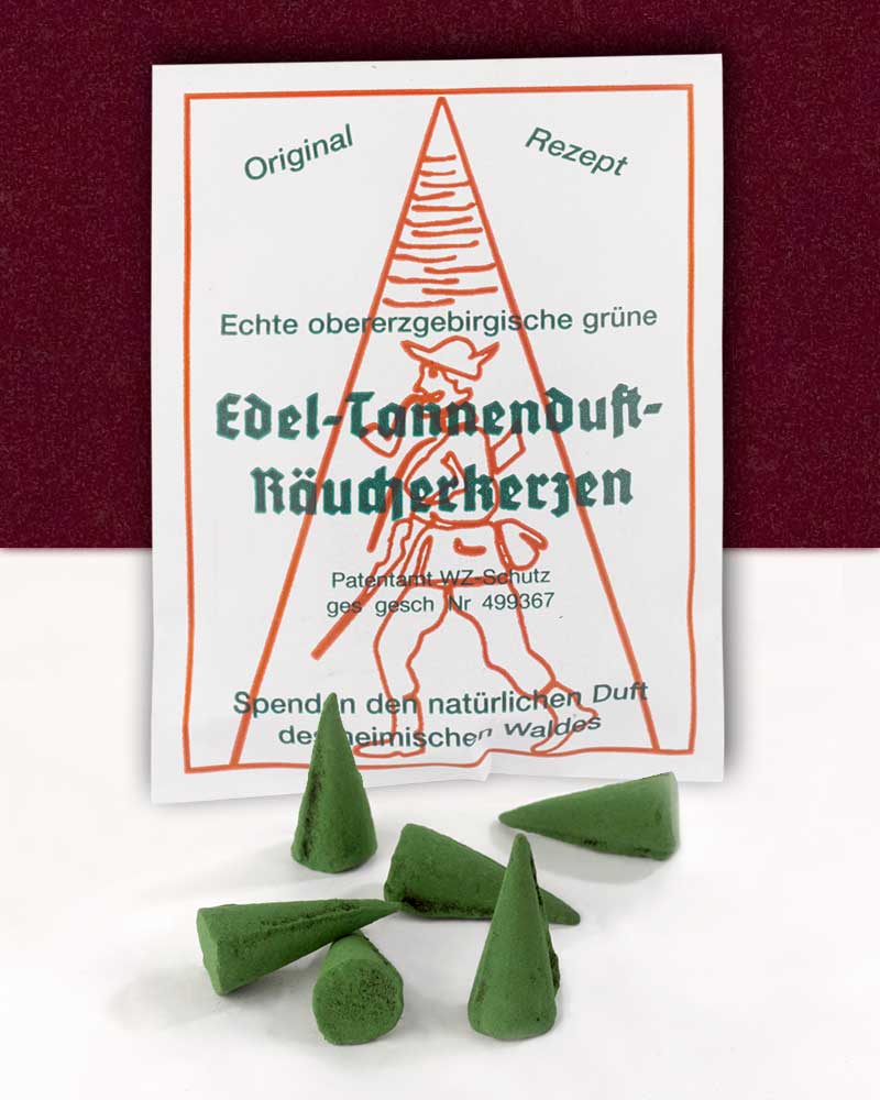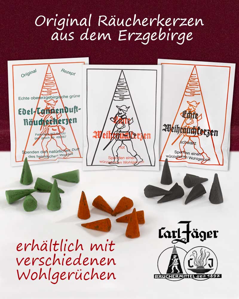 Nur feinste, natürliche Duftstoffe und ein Gemisch von Holzkohle und Harz kommen zum Einsatz. Mit Liebe uns Sorgfalt werden die Räucherkerzen anschließend in ihre handliche Kegelform gebracht. Die orginal Räucherkerzen aus dem Erzgebirge, werden auch heute noch nach alter Tradition von der Räuchermittelfabrik Carl Jäger hergestellt. Deshalb gelten diese Räucherwaren unter Kennern als die Besten mit einer oft kopierten, aber nie erreichten Qualität!