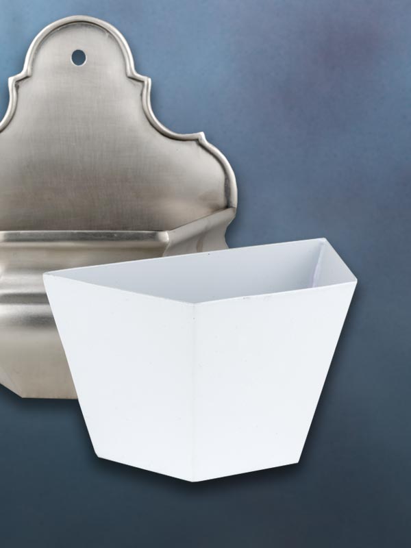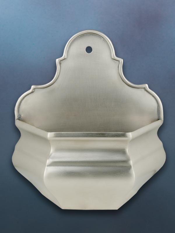 Weihwasser-Wandkessel, aus Messing matt, Zinnoptik antik gefaßt, 18 cm breit, 20 cm hoch, mit weiß emailliertem Metalleinsatz.