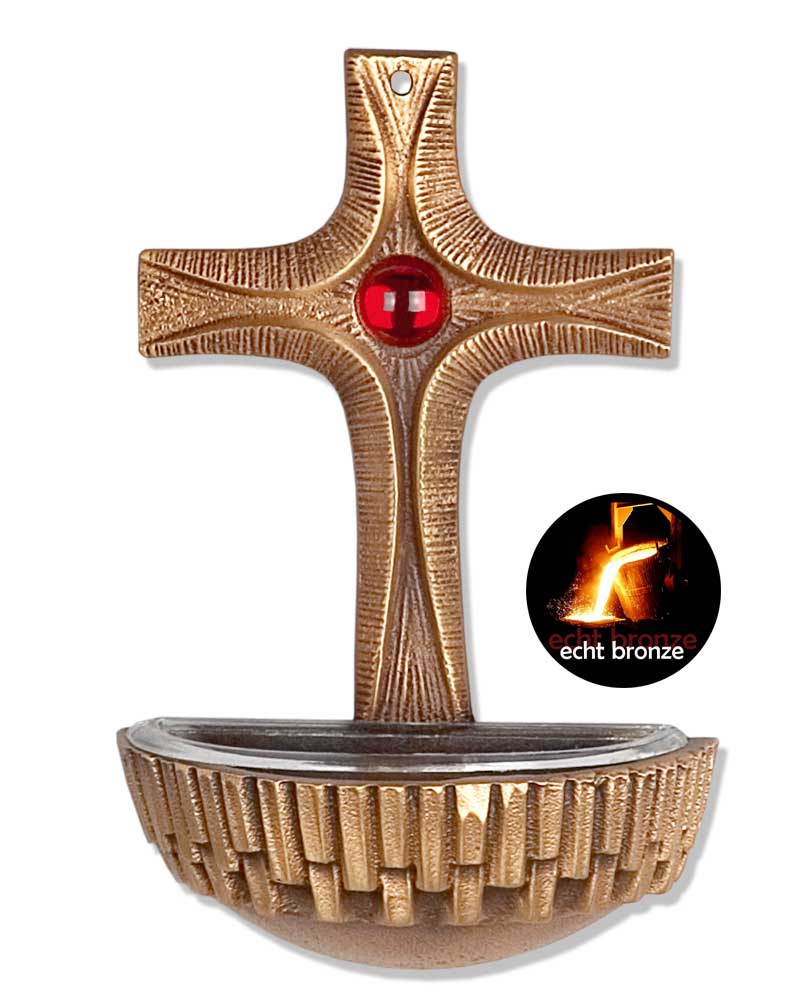 Weihwasserkessel 12 cm Kreuz mit rotem Glasstein