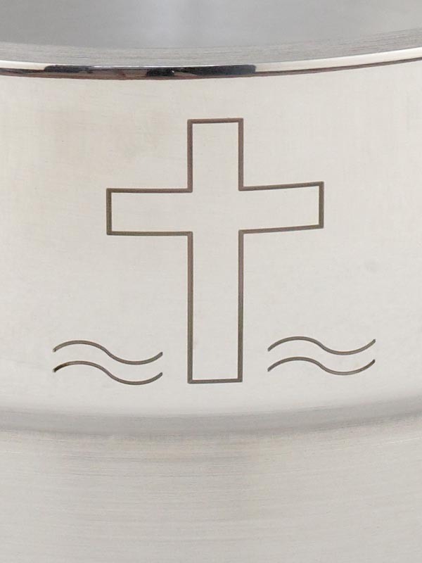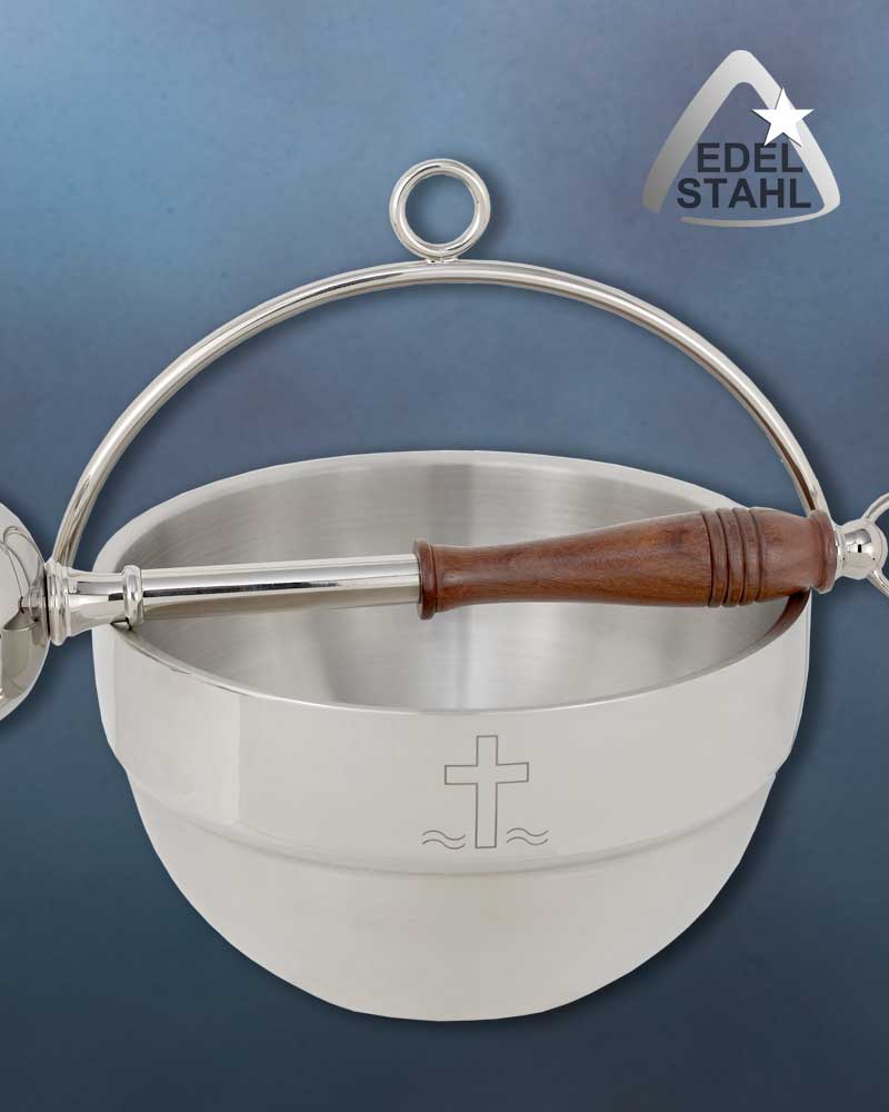 Der Weihwasserkessel aus rostfreiem Edelstahl verfügt über eine gebürstete Oberfläche und ist mit einer dezenten Kreuzgravur versehen. Er ist besonders robust, pflegeleicht und beständig gegen Kalk sowie Korrosion – ideal für den regelmäßigen liturgischen Einsatz. Die Ausführung mit stabilem, vernickeltem Standfuß sorgt für sicheren Halt, während der seitliche Tragegriff den Transport erleichtert. Mit einem Durchmesser von 18,5 cm und einer Höhe von 17 cm bietet der Kessel ausreichend Volumen und praktische Handhabung. Die Kombination aus Funktionalität, widerstandsfähigem Material und schlichtem Design macht ihn zu einer langlebigen Lösung für Kirchenräume und Sakristeien.