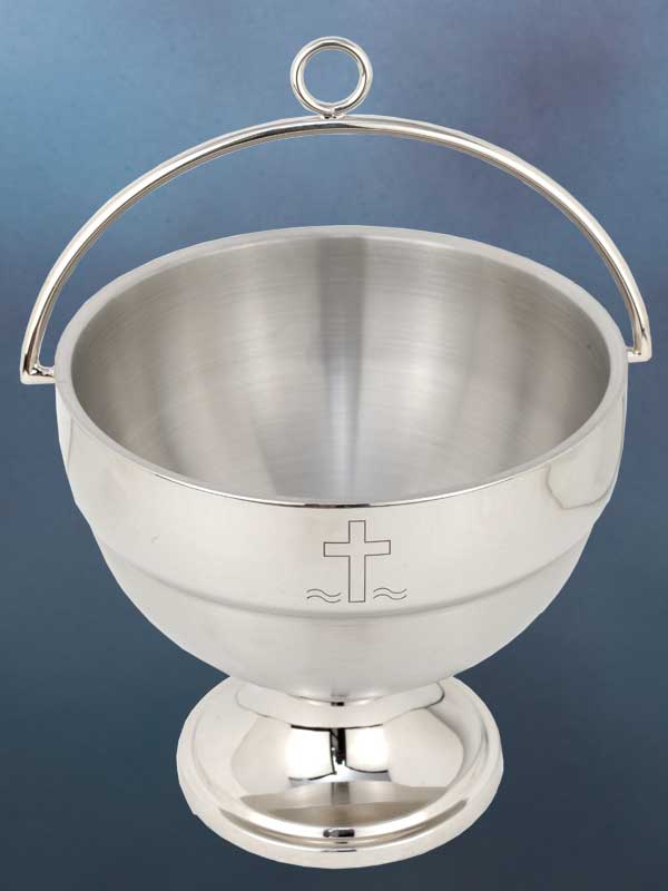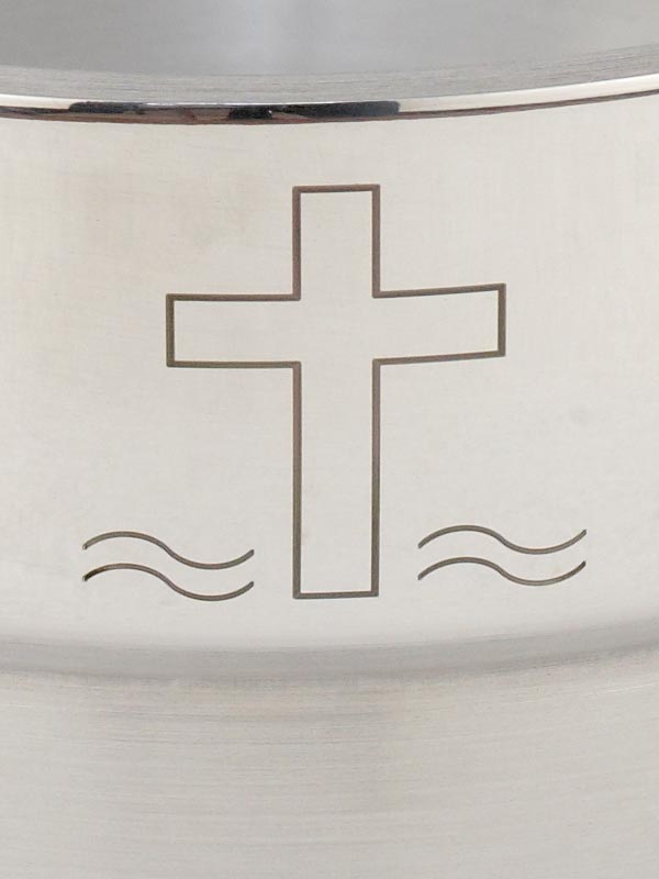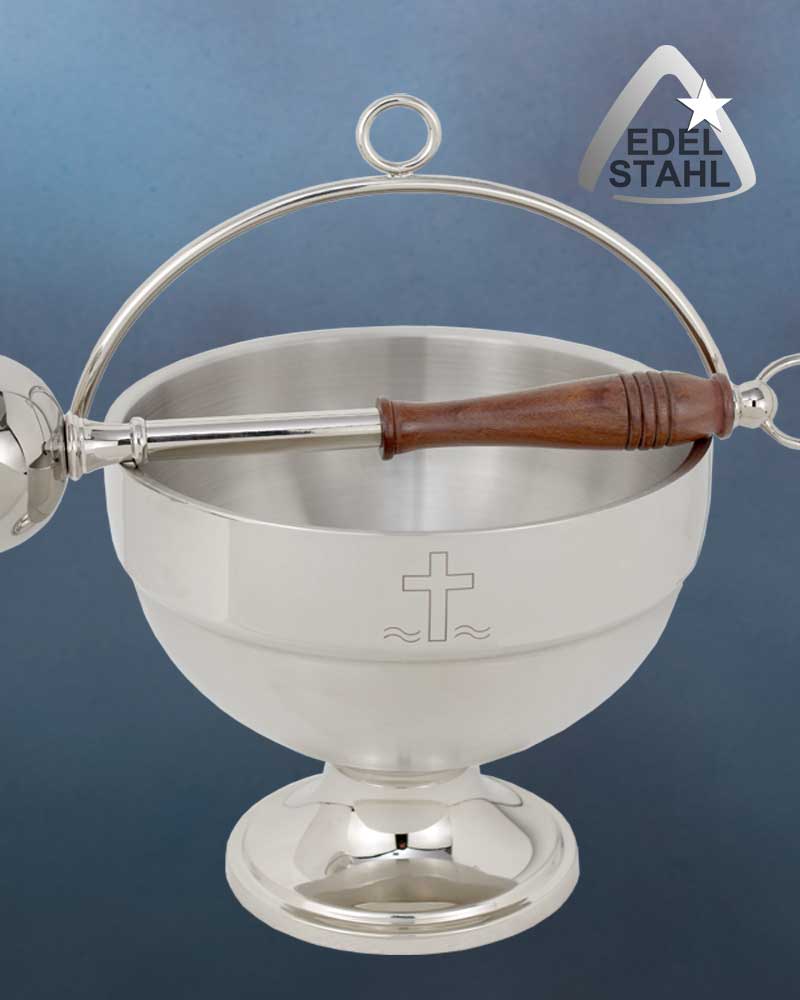 Weihwasserkessel mit Kreuzgravur, aus rostfreiem Edelstahl mit gebürsteter Oberfläche, unempfindlich und robust gegen Kalk und Korrosion. Ausführung mit sicherem Standfuß, in Messing vernickelt, mit Tragegriff. 18,5 cm Ø, 17 cm hoch