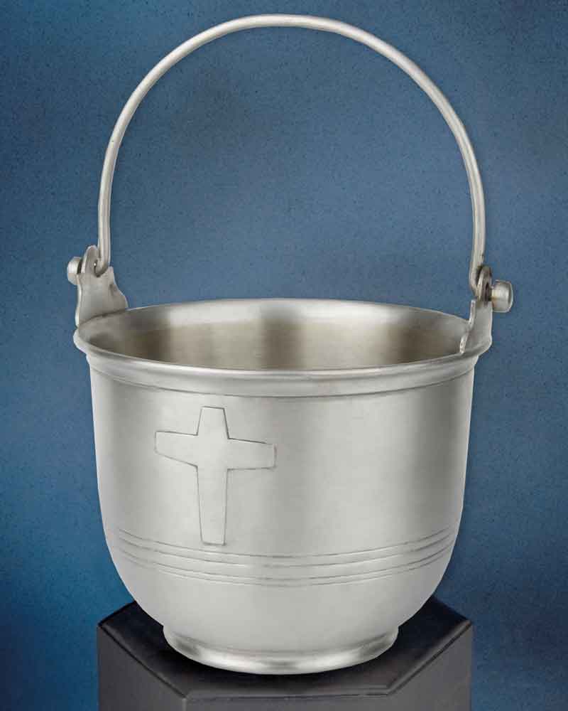 Weihwasserkessel, Messing vernickelt, in rustikaler Zinnoptik mit Kreuzapplikation, 17cm Ø, 16,5 cm hoch. Die tiefe Form ist auch gut für Borstenwedel geeignet.