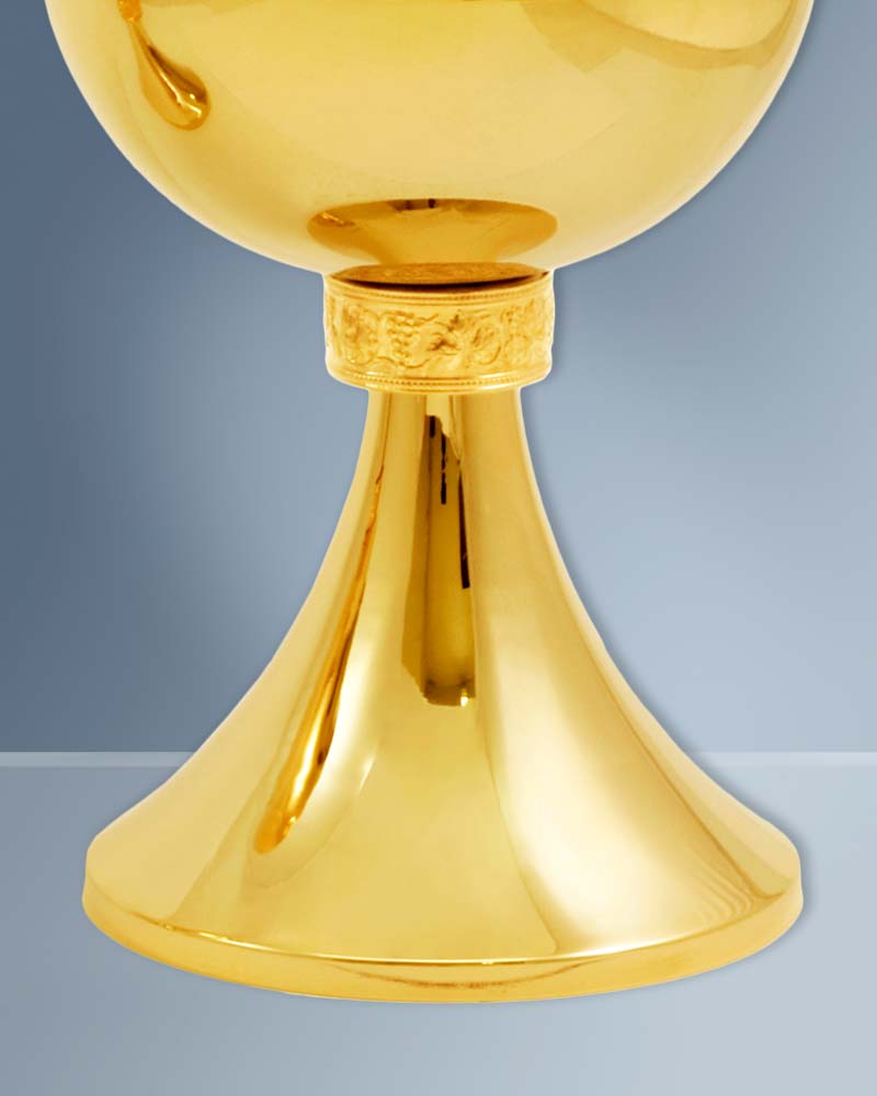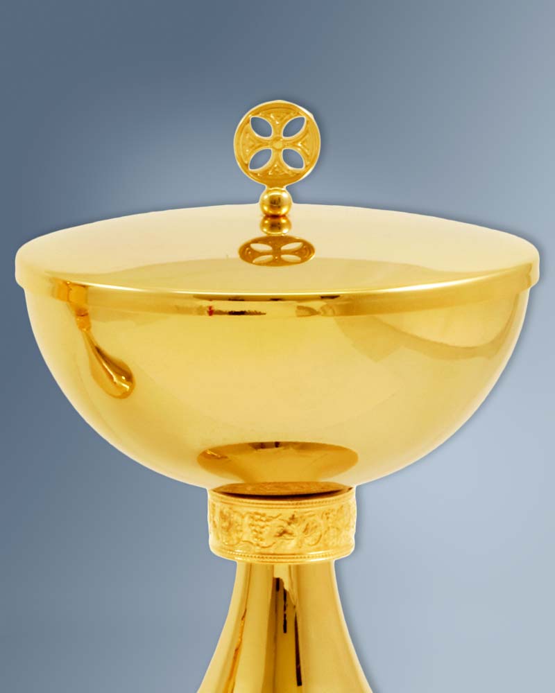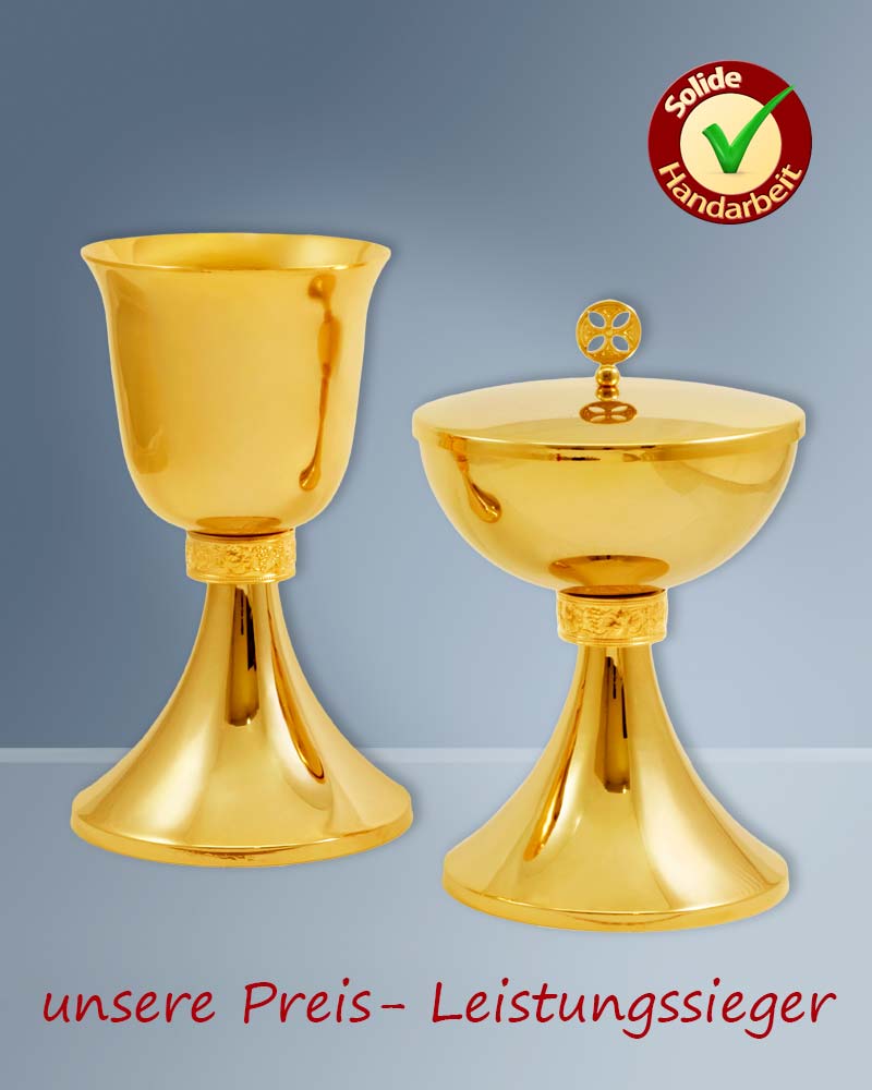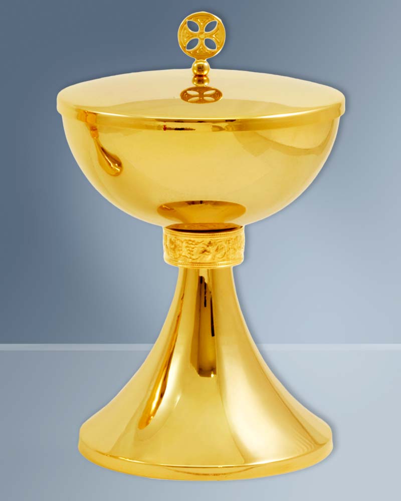 Dieses Ziborium ist eine hochwertige Handarbeit aus Messing, vergoldet. Die Gesamthöhe ist 17 cm, die Schale 11cm Ø ist mit bis zu 200 Brothostien befüllbar.