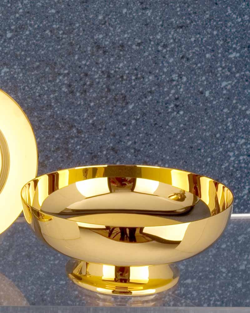 Hostienschale, 5,5 cm hoch, poliert, vergoldet und anlaufgeschützt. Die Schale hat 15 cm Ø und ein Fassungsvermögen für ca. 100 Brothostien.