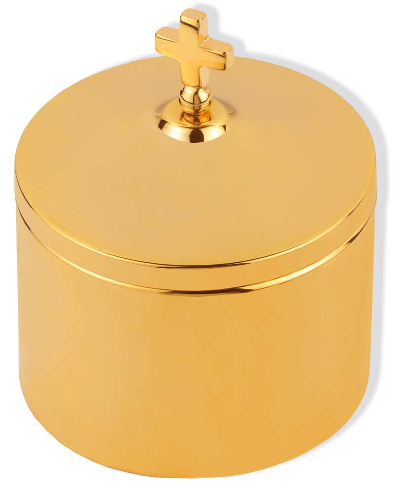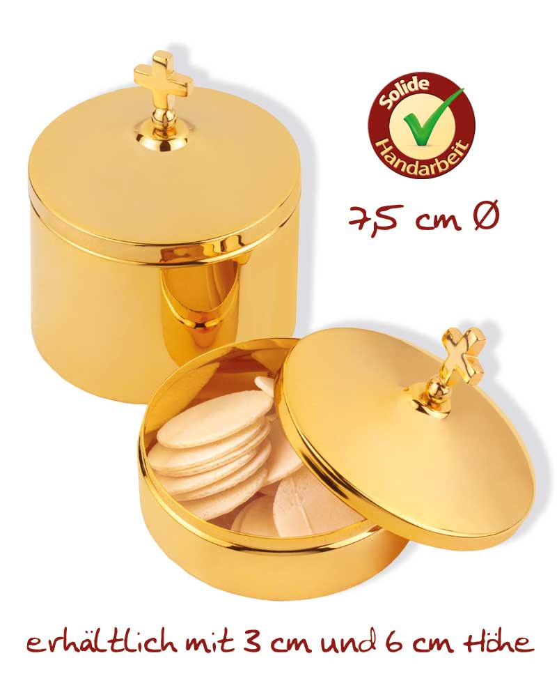 Hostiendosen aus Messing, in hochwertiger, vergoldeter Ausführung, 7,5 cm Ø, Deckel mit Abschlusskreuz. Hostiendose, 6 cm hoch, geeignet für ca. 100 Brothostien.