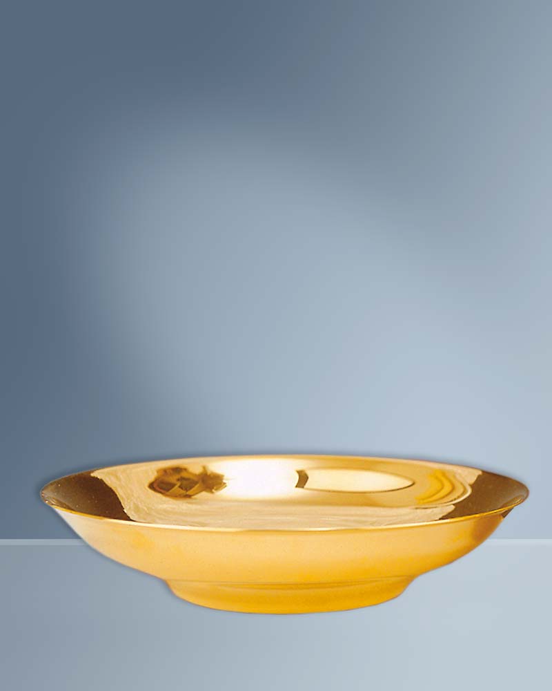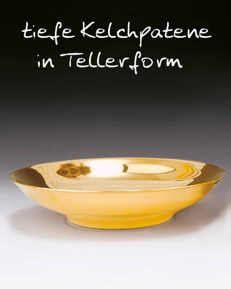 Kelchpatene 15 cm Ø, poliert und vergoldet. Die 3,5 cm tiefe Schale faßt ca. 100 Brothostien.