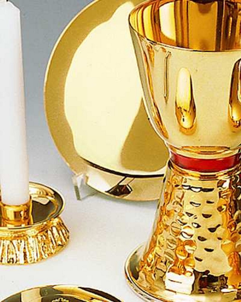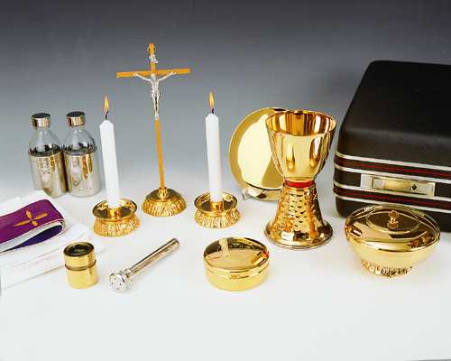 Messkoffer, Hartschale 46 x 35 x 16 cm, verschließbar, gefüttert mit rotem Moiree. Kelch 16 cm hoch mit Patene, Ziborium 12 cm Durchmesser und Hostiendose 8 cm Durchmesser mit Hostienheber, vergoldet. Zwei Glasflaschen mit vernickelter Ummantelung, Kreuz + Leuchter, Aspergill, Ölgefäß, Stola und Kelchwäsche, komplett