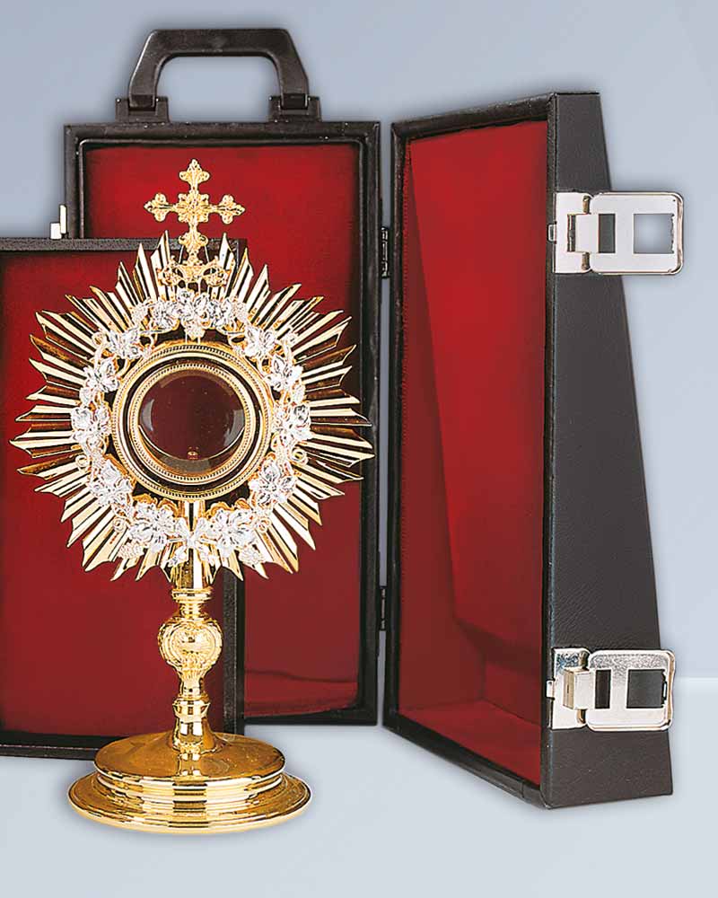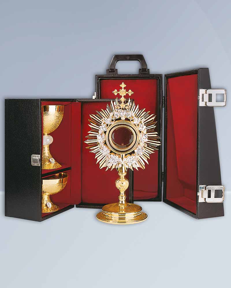 Die hier angebotenen Monstranzkoffer sind Standardetuis zu günstigen Preisen. Etui für Monstranz bis 60 cm Höhe, bis 35 cm Breite. Auf Wunsch fertigen wir auch individuell nach Ihren Maßangaben. Fordern Sie hierfür bitte unser unverbindliches Angebot an. Etuis zur schützenden Aufbewahrung von wertvollen Kirchenschätzen. Ausführung in Kunstleder, Polster mit Samtbezug. (ohne Deko wie Monstranz)