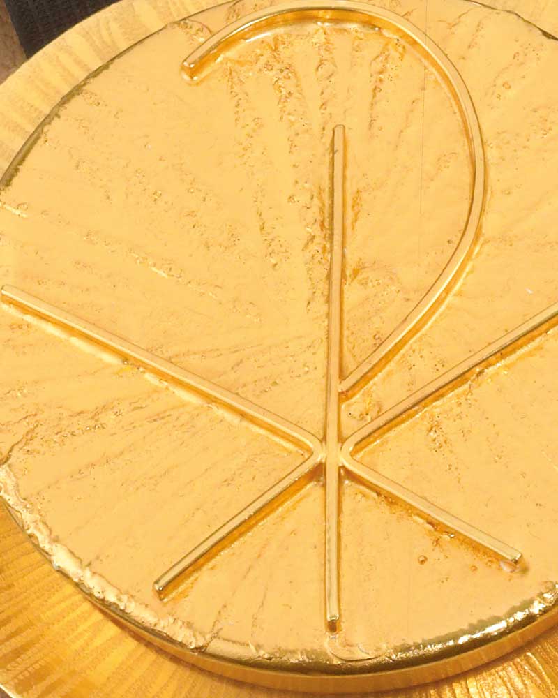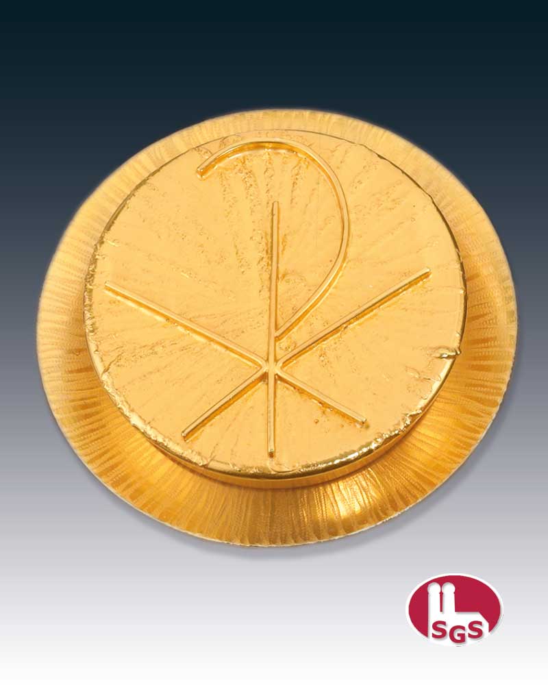 Versehpatene aus Messing vergoldet mit Griffrand, 10 cm Durchmesser. Den aufsteckbaren Deckel ziert ein von Hand gelötetes Christuszeichen. Pyxis mit feiner, strukturierter Oberfläche hat einen Durchmesser von ca. 8 cm und kann mit bis zu 30 Brothostien befüllt werden.