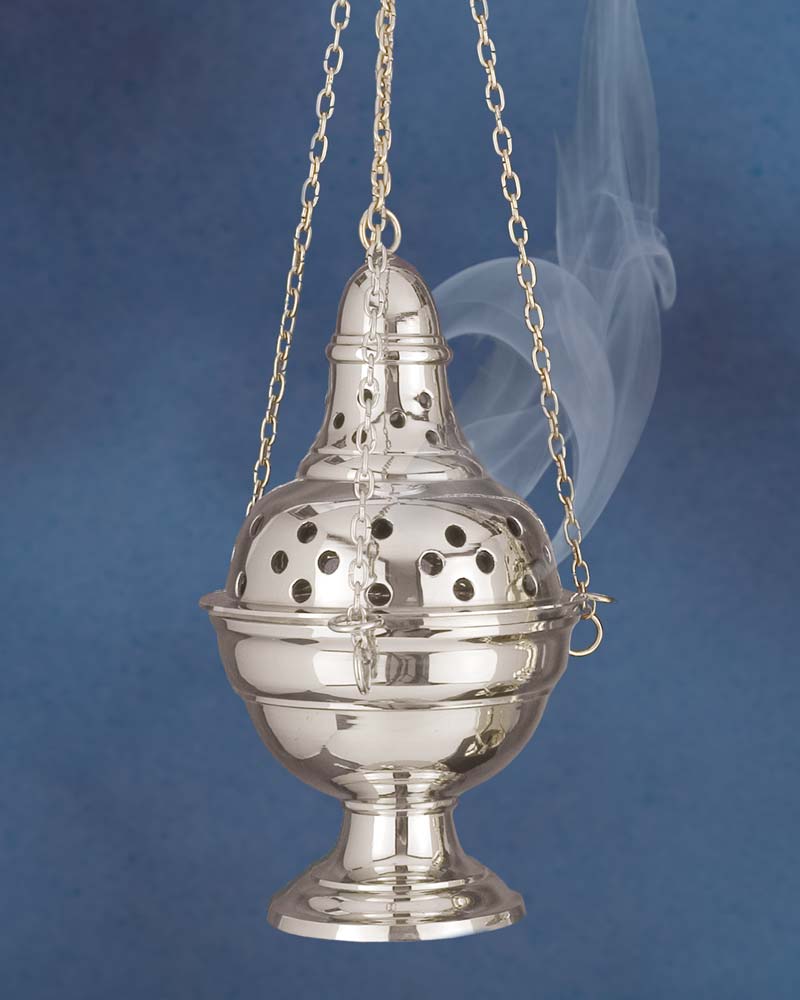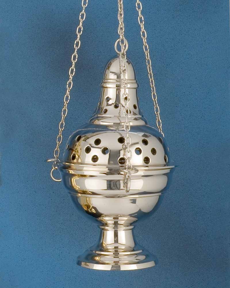 Rauchfass Messing vernickelt. Weihrauchschwenker aus Messing in barocker Form. Das Rauchfass mit großzügigen Rauchöffnungen, ist 23 cm hoch und hat 12 cm Ø, mit Kohleeinsatz.
